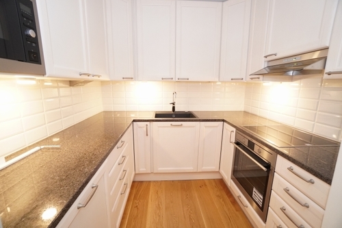 erillinen keittiö, kivitasot keittiössä, keraaminen- tai induktioliesi; liesituuletin, astianpesukone (60cm), jääkaappipakastin, tilaa isolle ruokapöydälle; paljon kaappitilaa; paljon työskentelytilaa