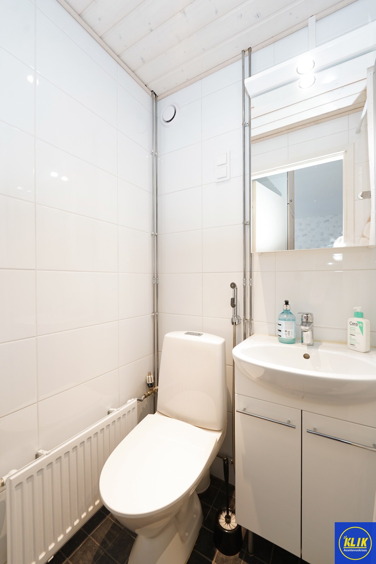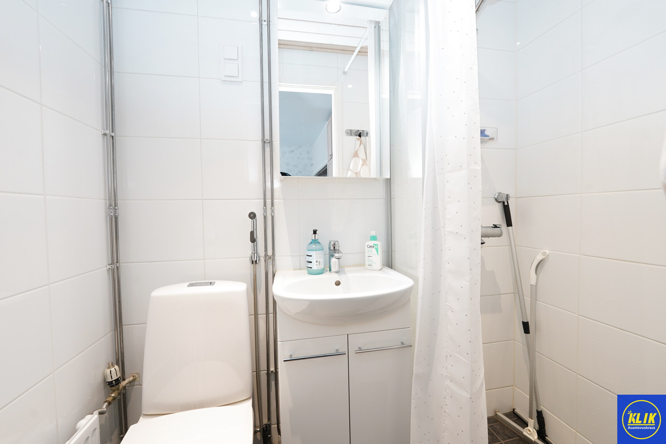 laattalattia; laattaseinä, allaskaappi; peilikaappi, suihku; suihkuseinä, Keittiössä valmiina pyykinpesukone vuokralaisen käyttöön, kylpyhuoneessa lattialämmitys; taloyhtiössä sauna