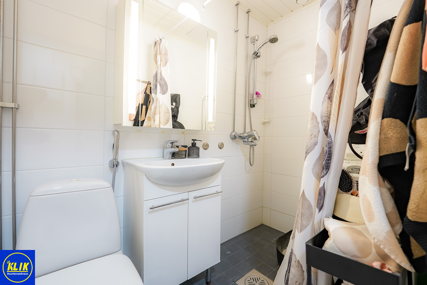 laattalattia; laattaseinä, , allaskaappi; peilikaappi, suihku, , pesukonevalmius, kylpyhuoneessa lattialämmitys; taloyhtiössä sauna