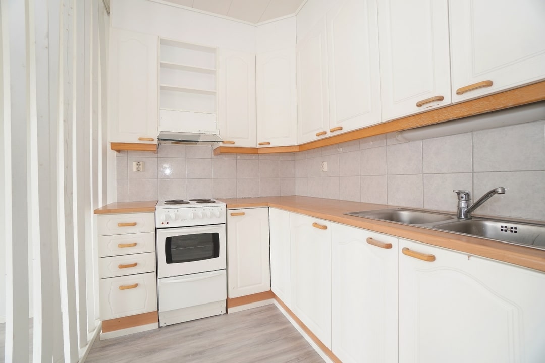 erillinen keittiö, laminaattitasot keittiössä, sähköliesi; liesituuletin, jääkaappipakastin, paljon kaappitilaa