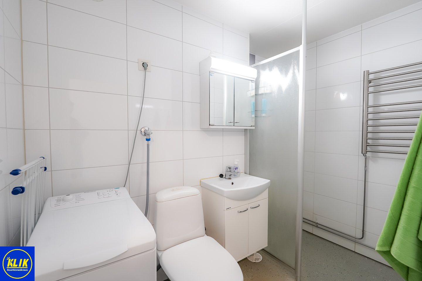 muovimatto; laattaseinä, allaskaappi; peilikaappi, suihku; suihkuseinä, pesukonevalmius, kylpyhuoneessa kuivauspatteri