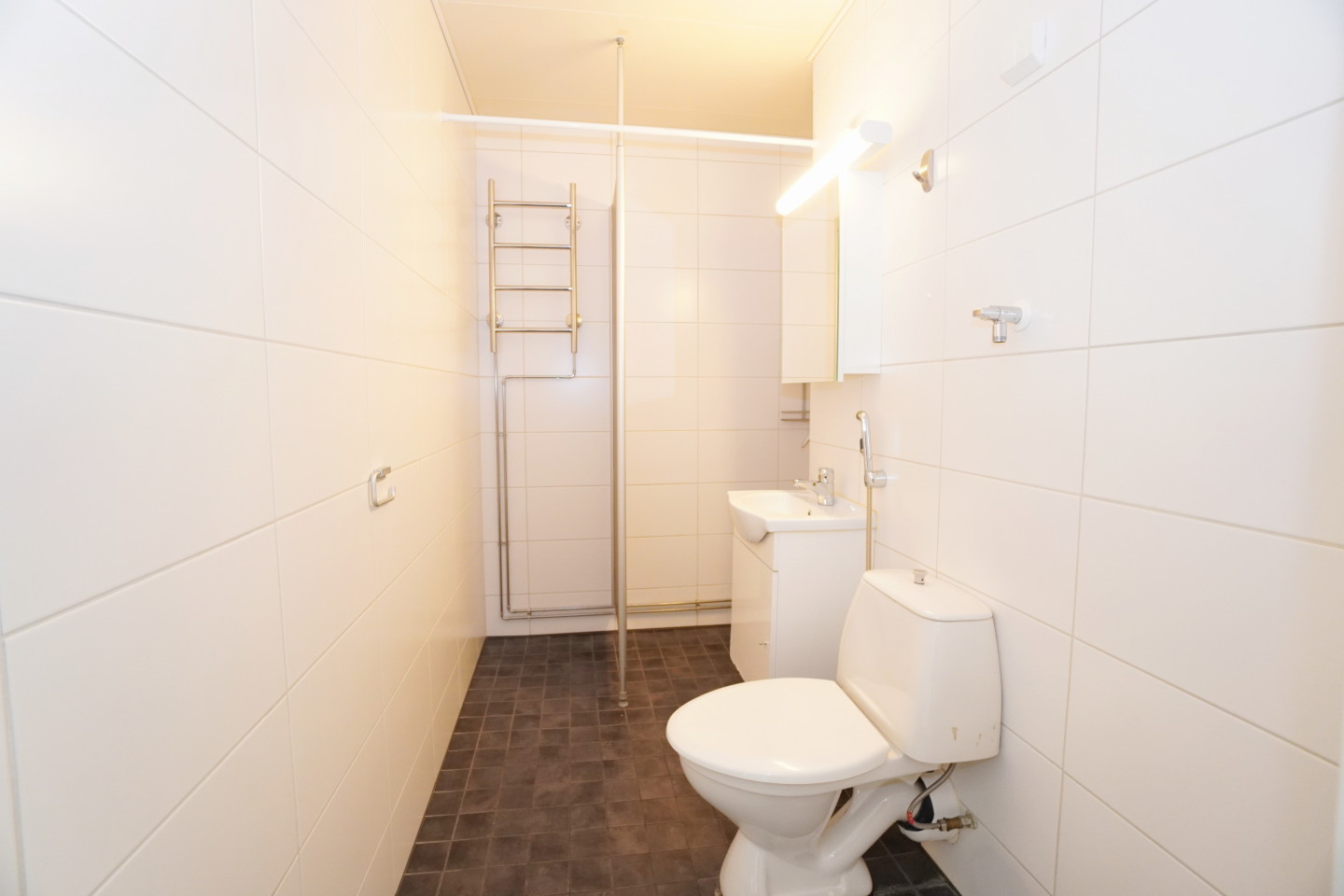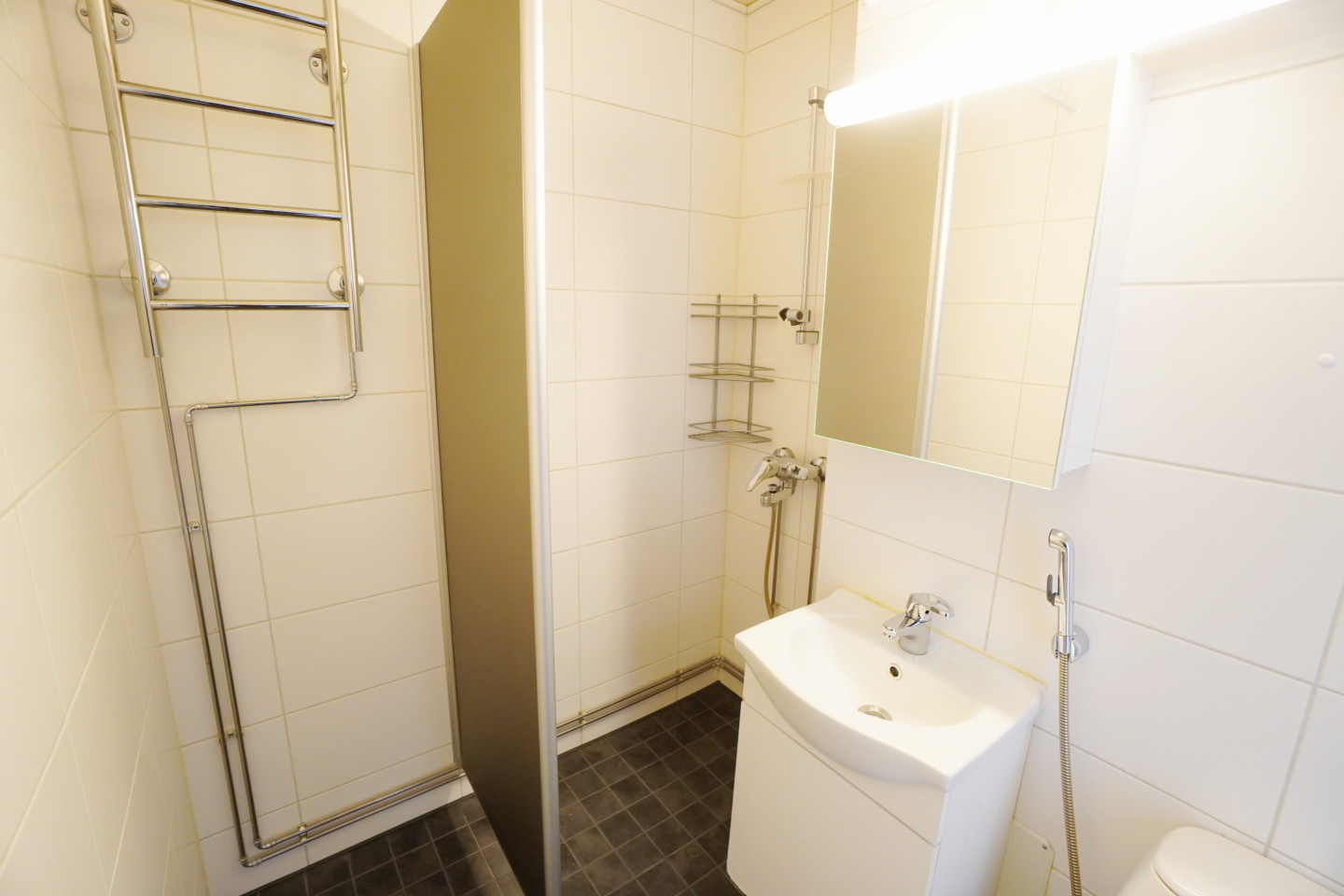 laattalattia; laattaseinä, , allaskaappi; peilikaappi, suihku; suihkuseinä, , pesukonevalmius, kylpyhuoneessa kuivauspatteri
