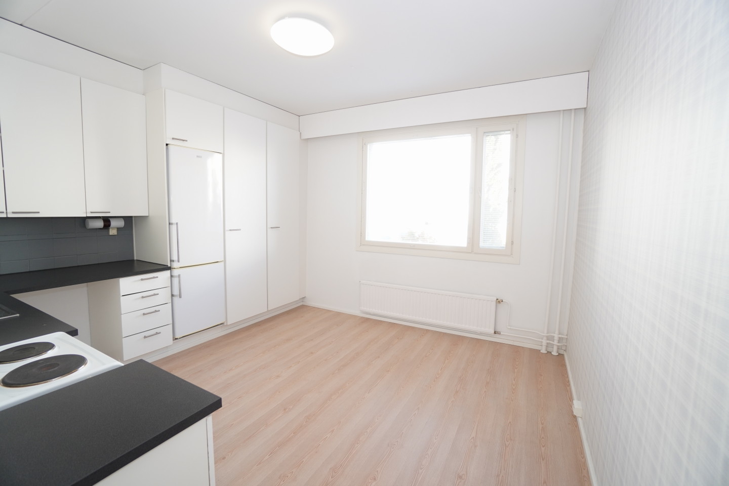 erillinen keittiölaminaattitasot keittiössä, sähköliesi, , jääkaappipakastin, tilaa isolle ruokapöydälle; paljon kaappitilaa; paljon työskentelytilaa