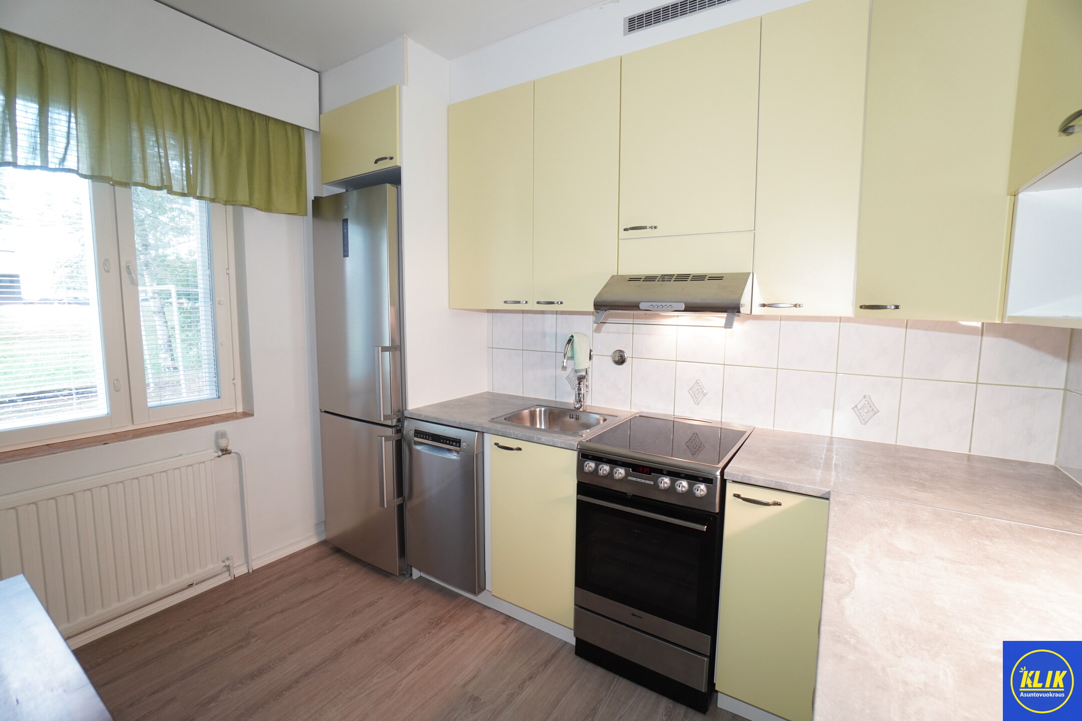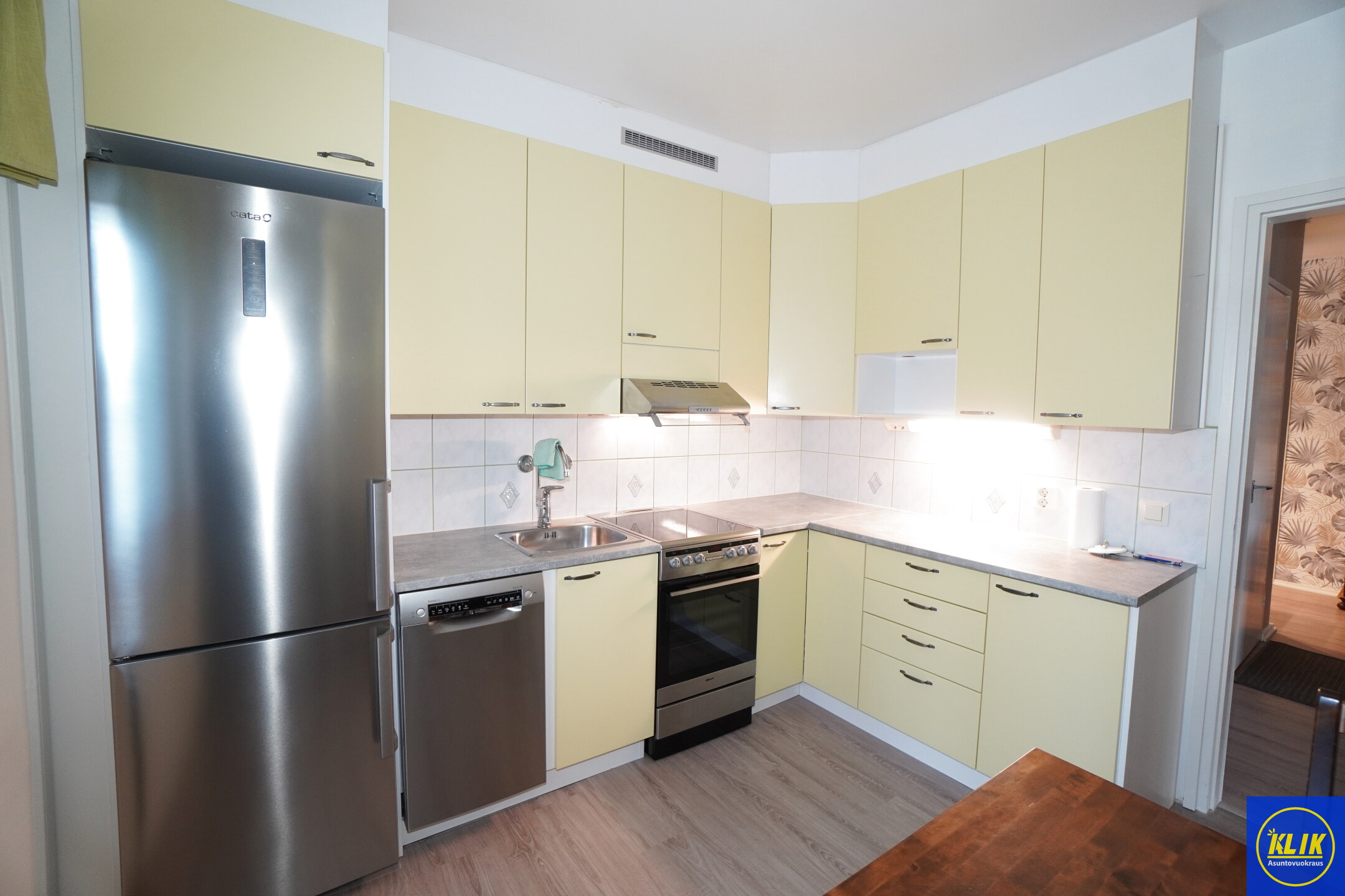 erillinen keittiölaminaattitasot keittiössä, keraaminen- tai induktioliesi; liesituuletin, astianpesukone (45cm), jääkaappipakastin, tilaa isolle ruokapöydälle; paljon kaappitilaa; paljon työskentelytilaa; mikrohylly