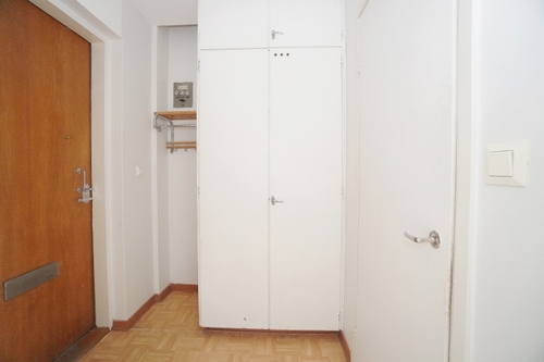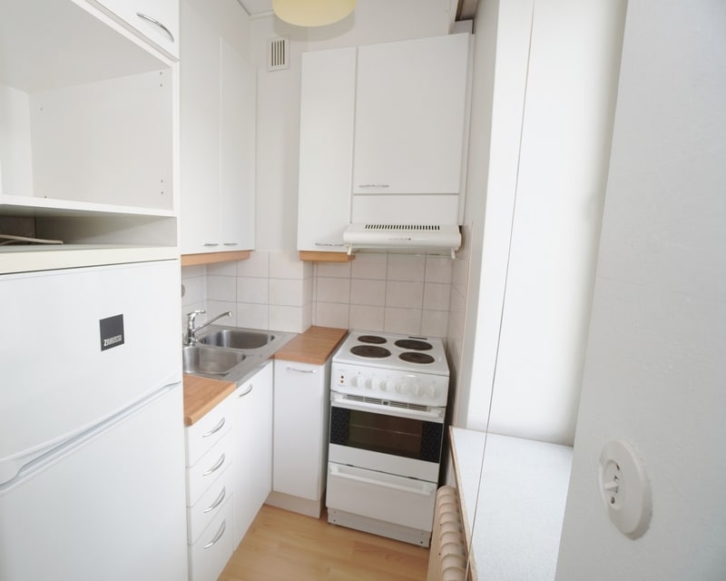 Kompaktin kokoisessa asunnossa on vaaleat pinnat ja asunto on valoisa. Keittokomerossa on valkoiset kaapit ja siistit kodinkoneet. Huoneen yhteyteen mahtuu sänky sekä muut tarvittavat huonekalut. Kylpyhuone on laatoitettu ja kompaktin kokoinen. Asunnon ikkunat ovat sisäpihan suuntaan. Eteisessä on kaapistoja säilytystä ajatellen.