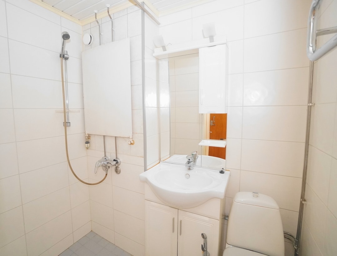 laattalattia; laattaseinä, allaskaappi, suihku, taloyhtiössä pesutupa, rättipatteri
