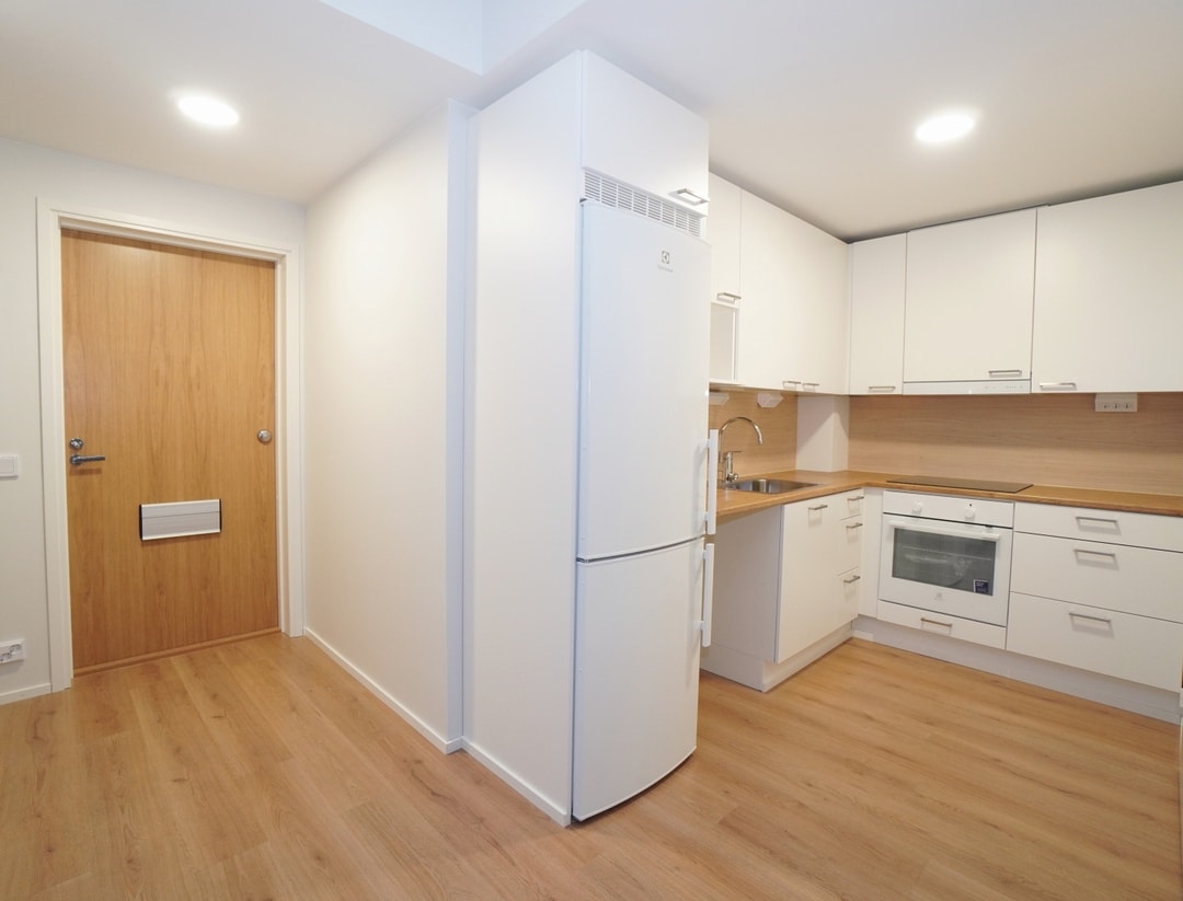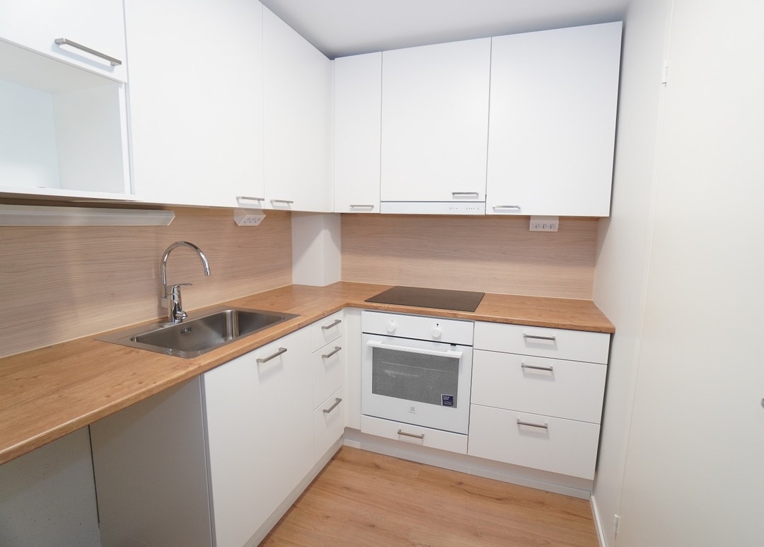 Keittiössä on nykyaikaiset kodinkoneet ja valkoiset kaapistot. Astianpesukone asennetaan keittiöön vielä ennen asukasta.