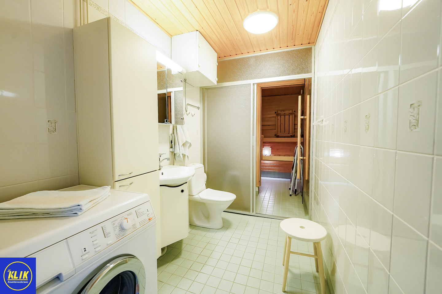 laattalattia; laattaseinä, , allaskaappi; peilikaappi; muuta säilytystilaa WC:ssä, suihku; suihkuseinä, , pesukonevalmius, kylpyhuoneessa lattialämmitys; oma sauna