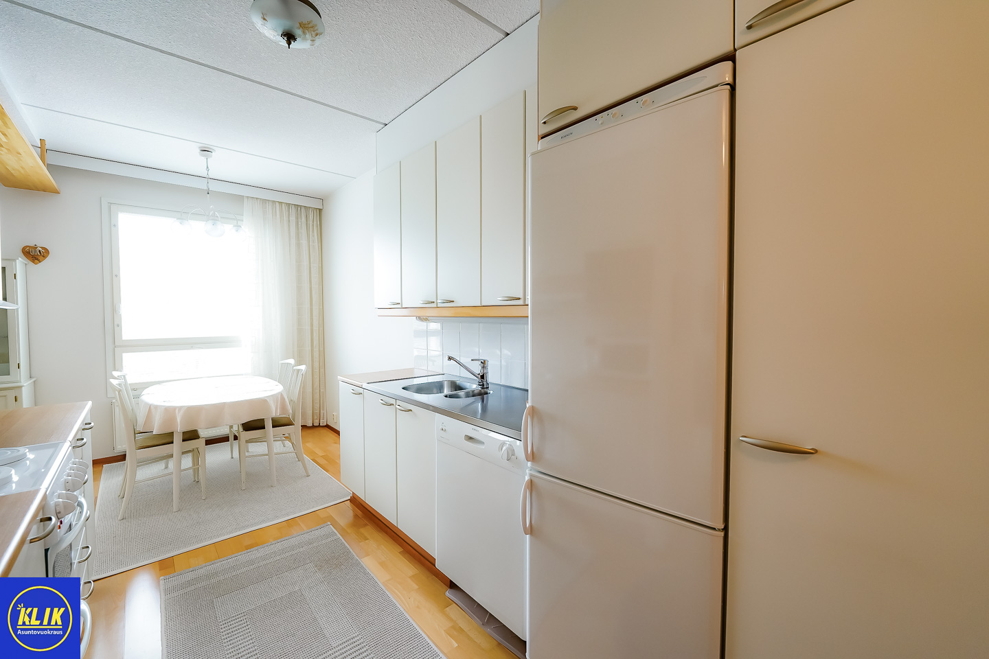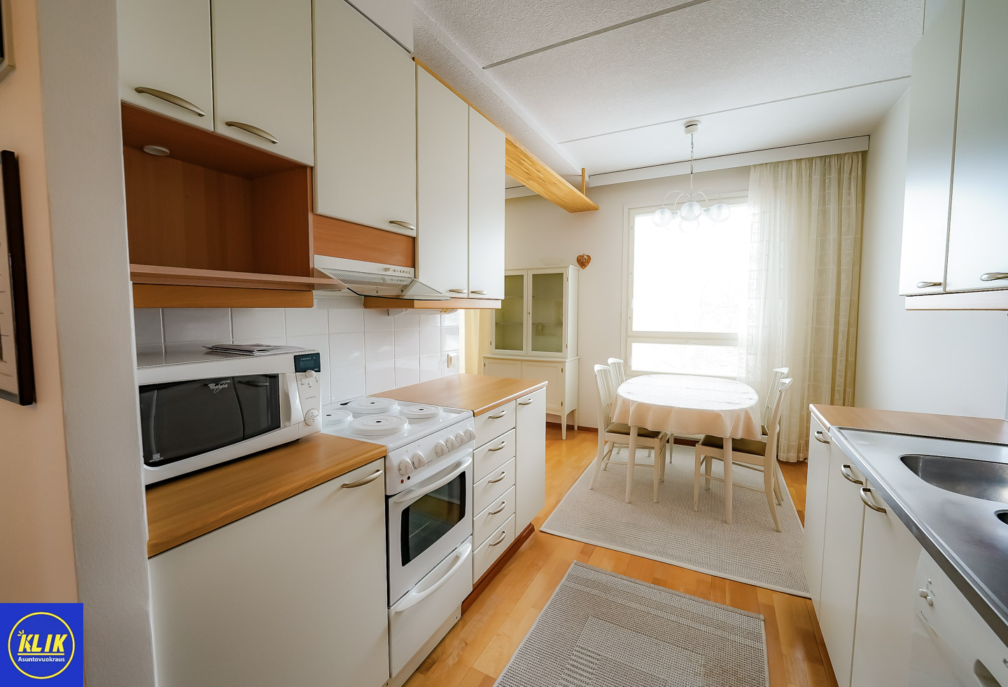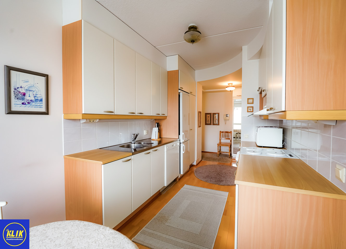 avokeittiölaminaattitasot keittiössä, sähköliesi, astianpesukone (60cm), jääkaappipakastin, paljon kaappitilaa; paljon työskentelytilaa; mikrohylly