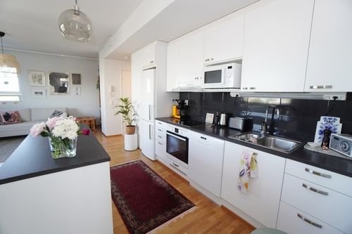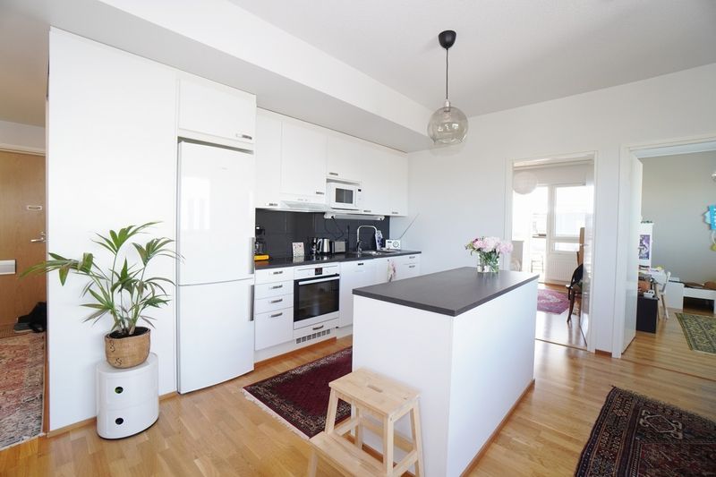 Keittiö ja olohuone ovat avarasti samassa tilassa. Keittiöstä löytyy kaikki tarpeellinen mm. astianpesukone, jääkaappipakastin, keittotaso ja uuni. Keittiön yhteydessä myös saareke, josta saat lisää työskentely- ja laskutilaa. Molemmissa makuuhuoneissa on kaappitilaa ja tämän lisäksi komeroita löytyy myös eteisestä.