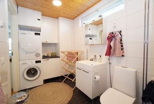 Tilavassa kylpyhuoneessa on paljon kaappitilaa ja vuokraan sisältyy siisti pesukone ja kuivausrumpu. Lisäksi kylpyhuoneen yhteydessä on oma sauna.