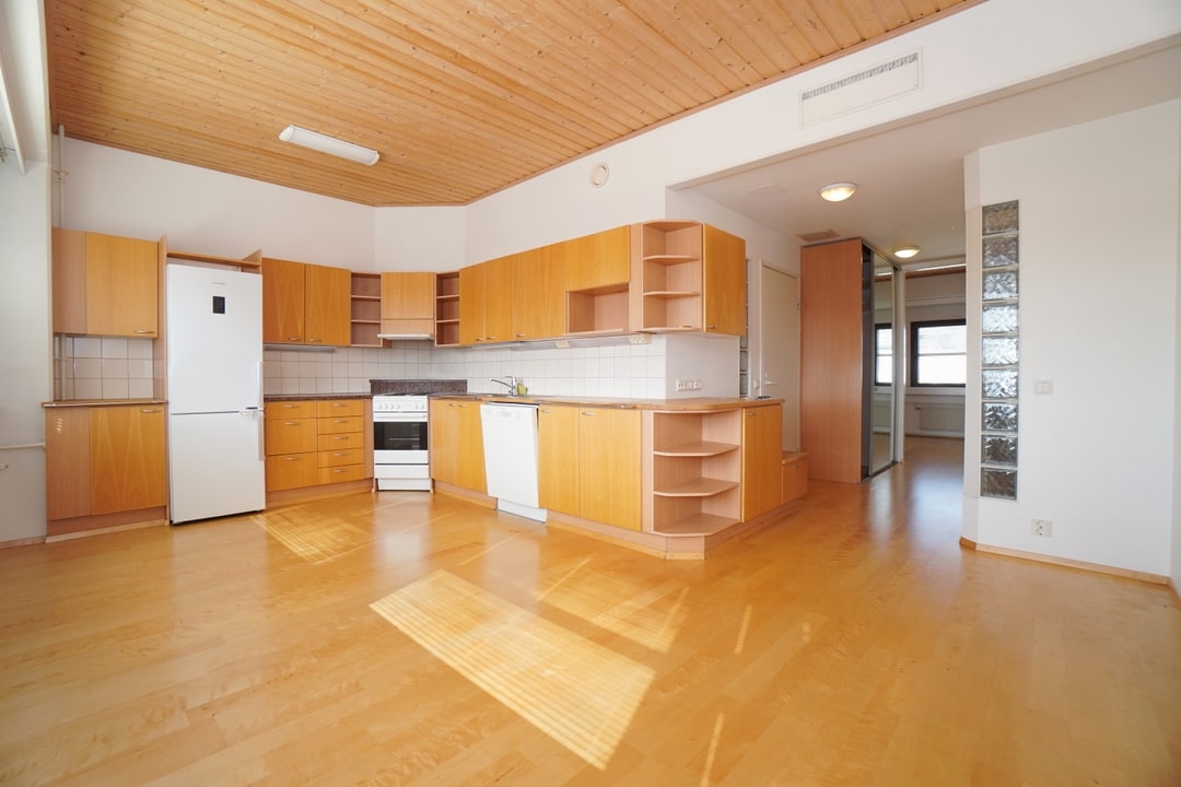 avokeittiö, puutasot keittiössä; kivitasot keittiössä, sähköliesi; liesituuletin, astianpesukone (60cm), jääkaappi; pakastin, paljon kaappitilaa; paljon työskentelytilaa; mikrohylly