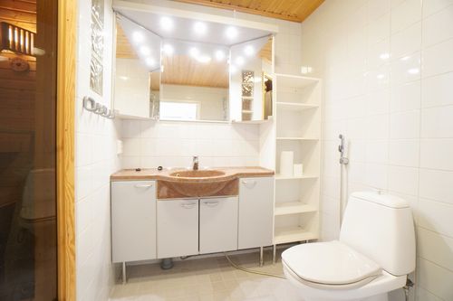 laattalattia; laattaseinä, allaskaappi; peilikaappi; muuta säilytystilaa WC:ssä, suihku, pesukonevalmius, sauna
