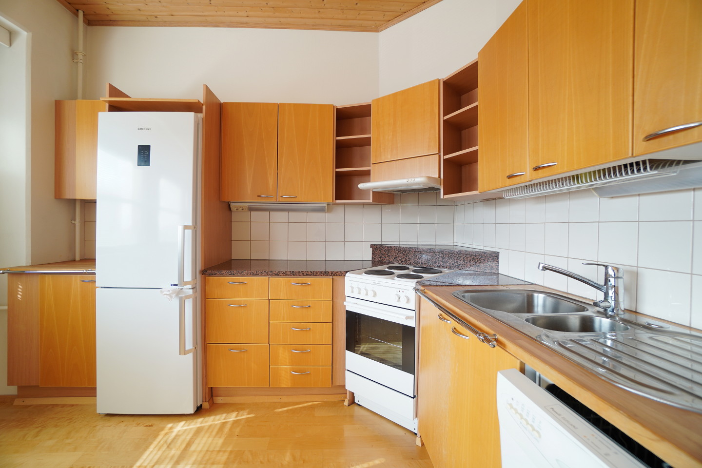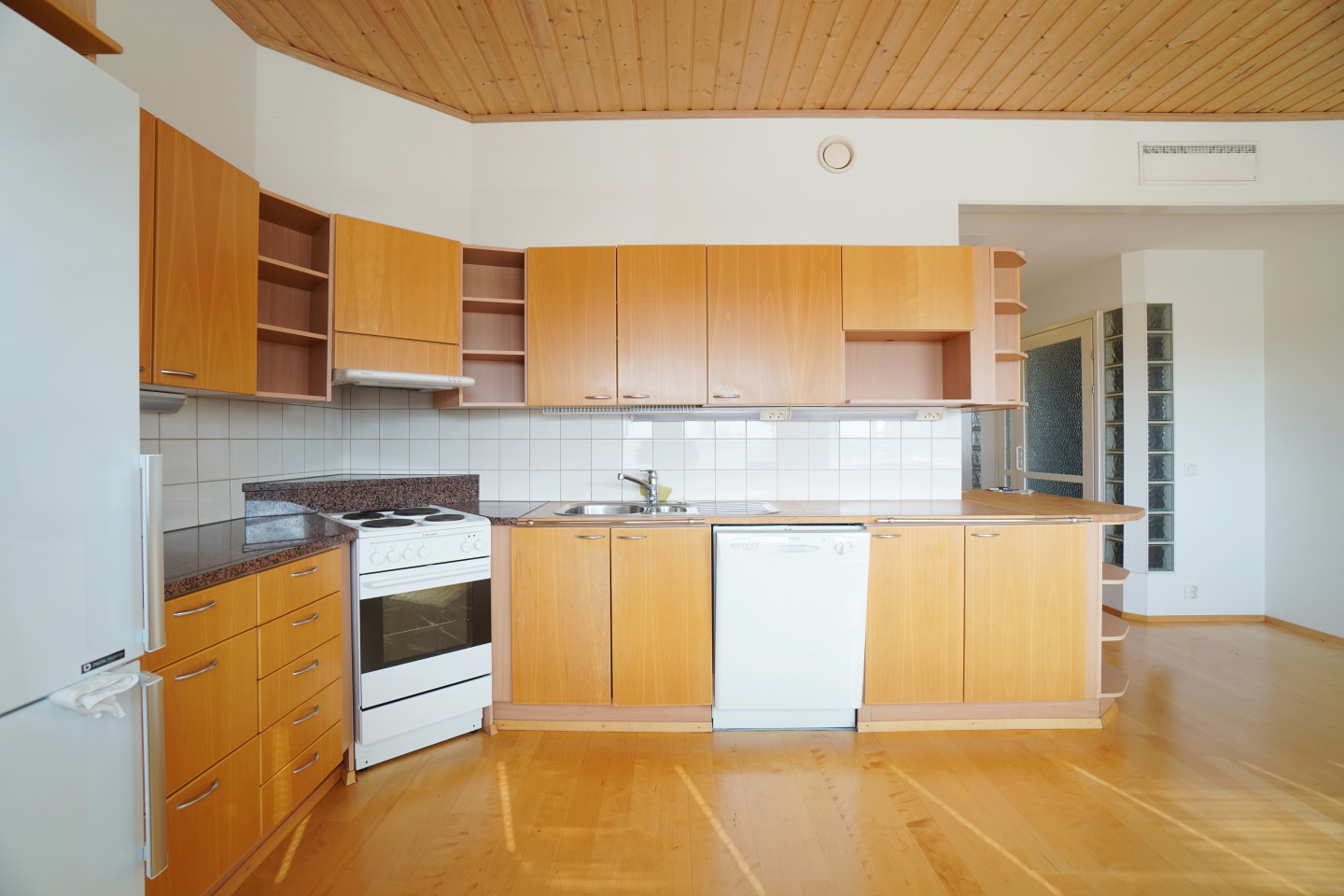 avokeittiöpuutasot keittiössä; kivitasot keittiössä, sähköliesi; liesituuletin, astianpesukone (60cm), jääkaappi; pakastin, paljon kaappitilaa; paljon työskentelytilaa; mikrohylly , , , , , ,