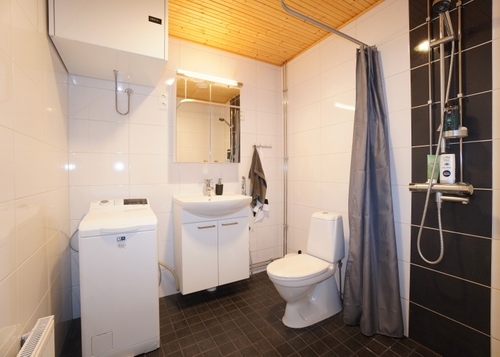 Kylpyhuone on tilava ja tilassa on lattialämmitys. Pyykinpesukoneelle on liitännät ja kalusteet ovat siistit.