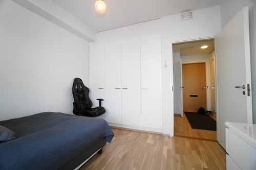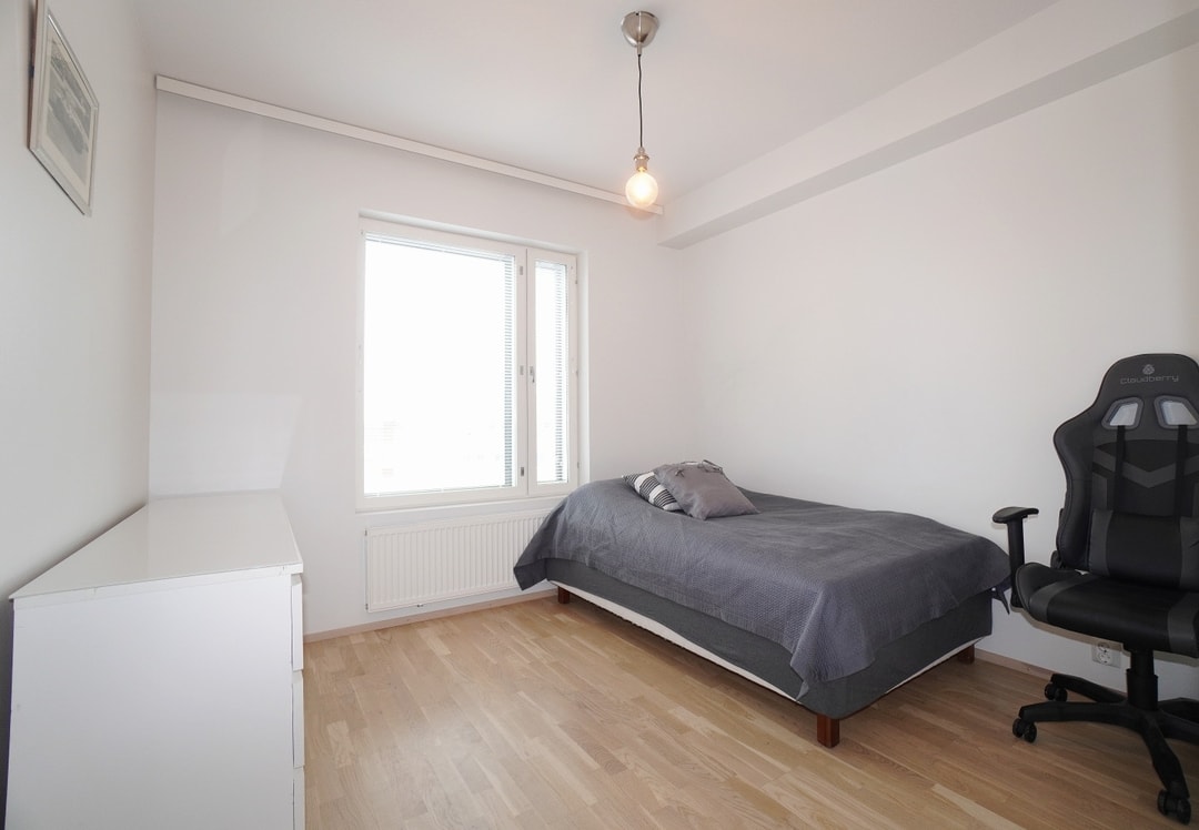 Makuuhuone sijoittuu sekin rauhallisen sisäpihan suuntaan. Makuuhuoneessa ja eteisessä on runsaasti kaapistoja säilytystä ajatellen.