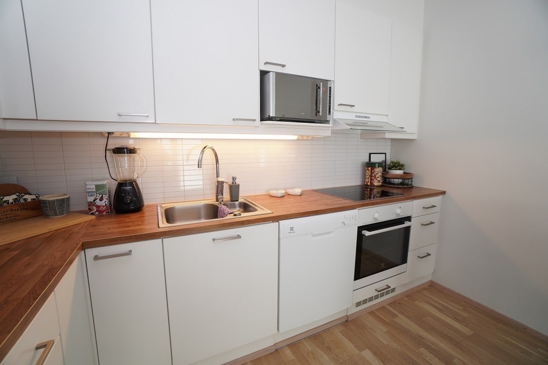 erillinen keittiö, laminaattitasot keittiössä, keraaminen- tai induktioliesi; liesituuletin, astianpesukone (60cm), jääkaappipakastin, tilaa isolle ruokapöydälle; paljon kaappitilaa; paljon työskentelytilaa; mikrohylly