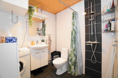 laattalattia; laattaseinä, allaskaappi; peilikaappi, suihku, pesukonevalmius, lattialämmitys