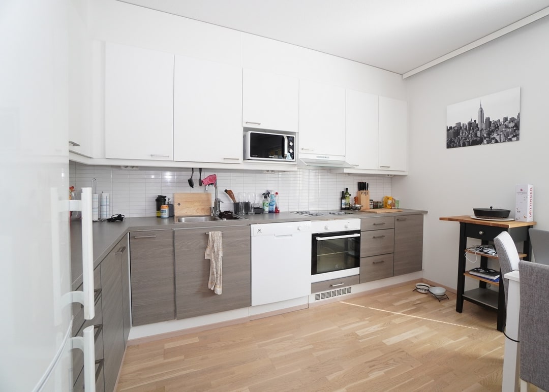 Hieno asunto, joka on siistissä kunnossa. Toimiva pohjaratkaisu ja siistit pinnat tekevät asumisesta viihtyisää. Tilava kylpyhuone, jossa on liitännät pesukoneelle. Keittiössä on reilusti kaapistoja ja modernit kodinkoneet, mukaan lukien astianpesukone. Avokeittiö ja olohuone toimivat saumattomasti yhdessä. Iso lasitettu parveke kuuluu tähän asuntoon.