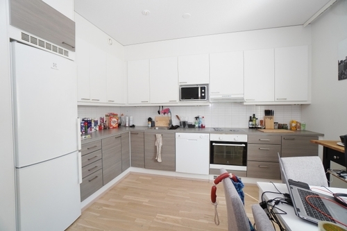 avokeittiö, laminaattitasot keittiössä, keraaminen- tai induktioliesi; liesi ja uuni erikseen; liesituuletin, astianpesukone (60cm); pesukoneliitos, jääkaappipakastin, tilaa isolle ruokapöydälle; paljon kaappitilaa; paljon työskentelytilaa; mikrohylly