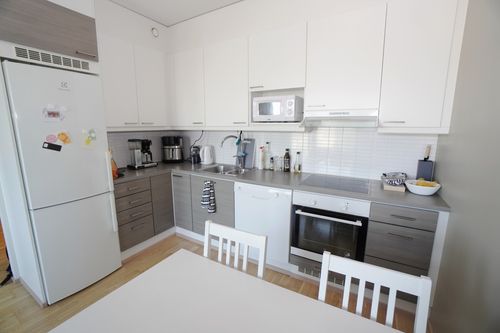 avokeittiö, laminaattitasot keittiössä, keraaminen- tai induktioliesi; liesi ja uuni erikseen; liesituuletin, astianpesukone (60cm), jääkaappipakastin, tilaa isolle ruokapöydälle; paljon kaappitilaa
