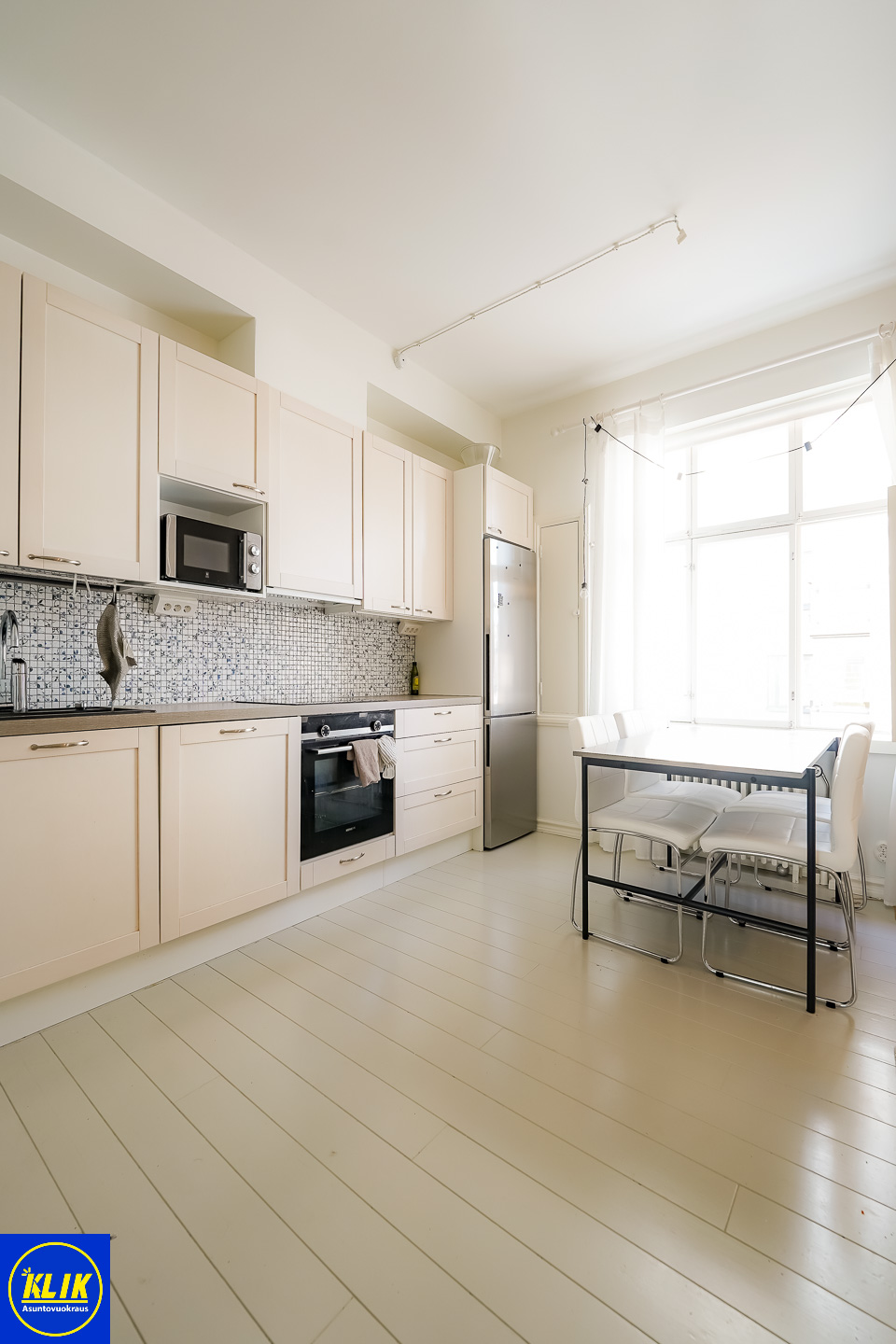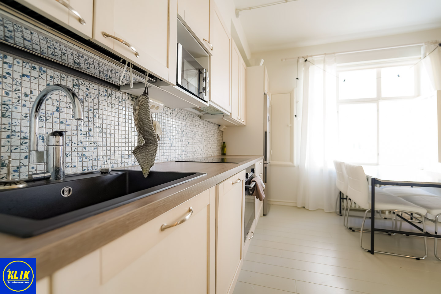 avokeittiölaminaattitasot keittiössä, keraaminen- tai induktioliesi; keittotaso ja kalusteuuni; liesituuletin, astianpesukone (60cm), jääkaappipakastin, tilaa isolle ruokapöydälle; paljon kaappitilaa; paljon työskentelytilaa; mikrohylly , , , , , ,