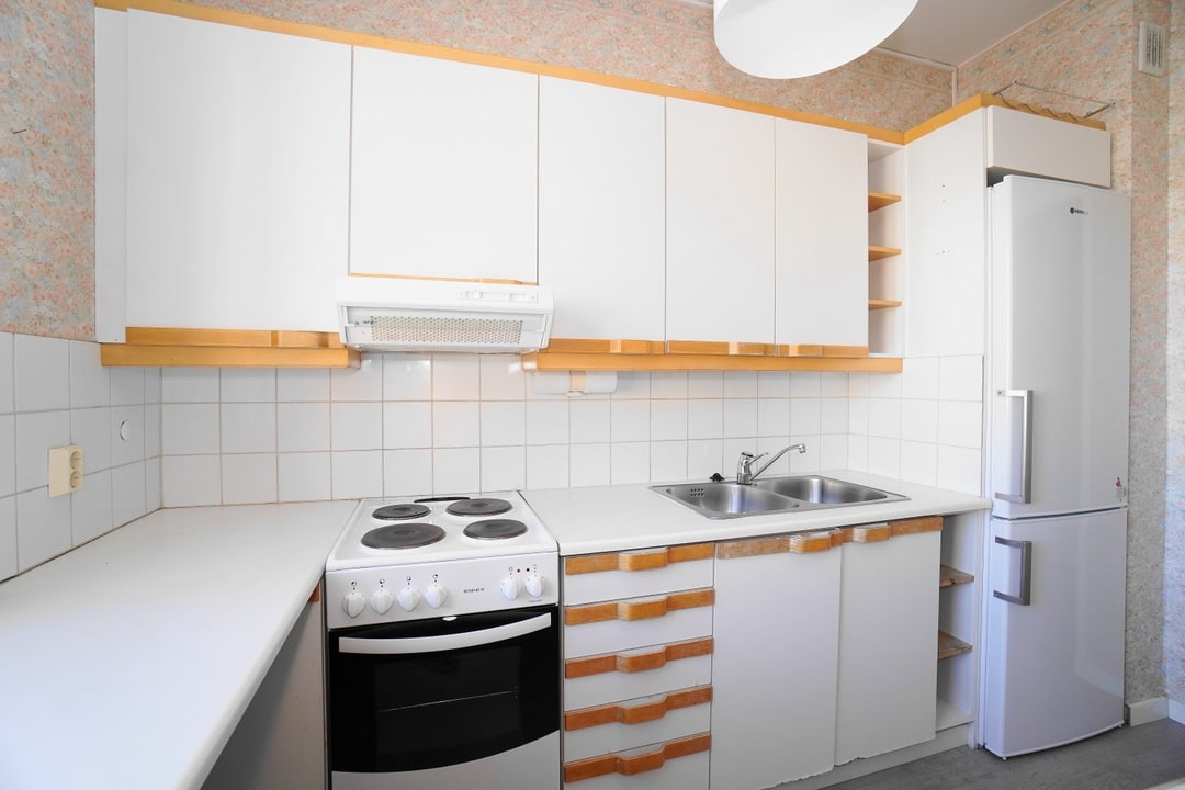 erillinen keittiö, laminaattitasot keittiössä, sähköliesi; liesituuletin, jääkaappipakastin, paljon kaappitilaa