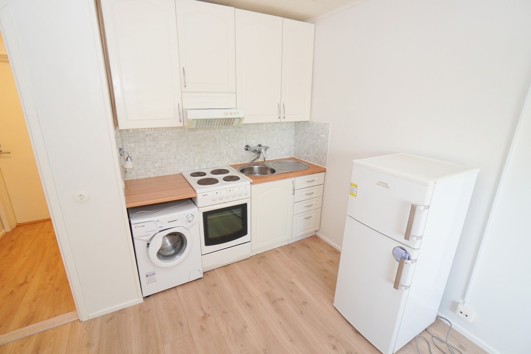 avokeittiö, laminaattitasot keittiössä, sähköliesi; liesituuletin, pesukoneliitos, jääkaappipakastin