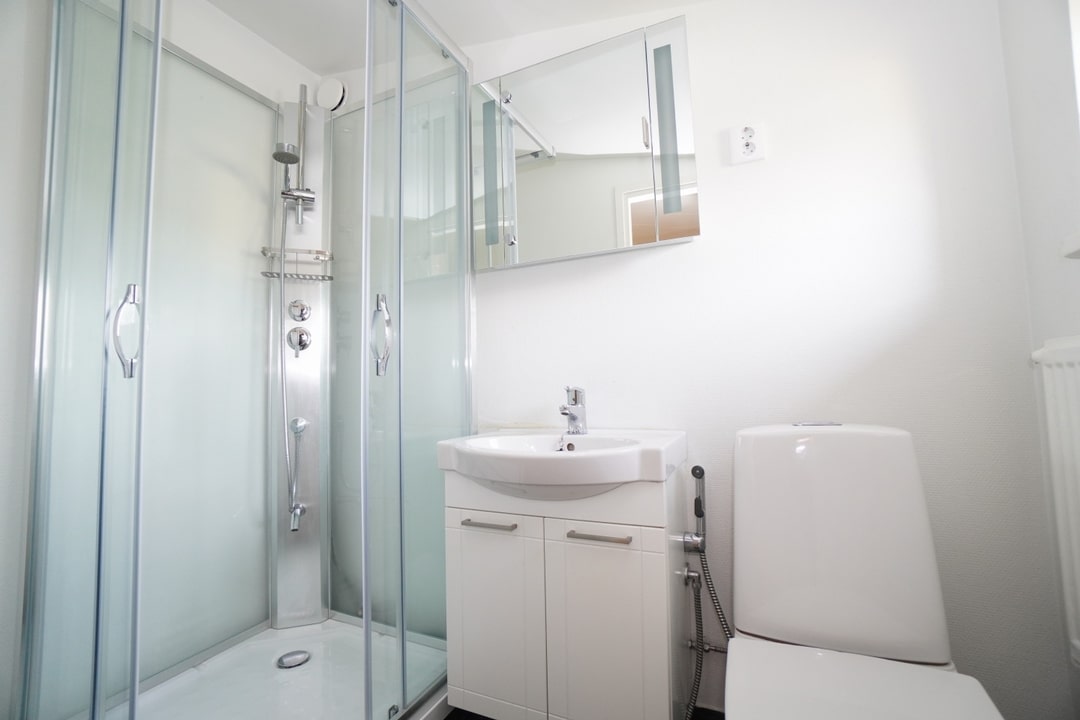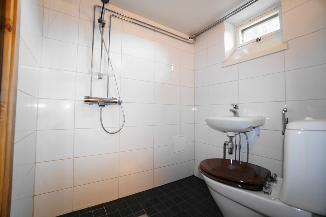 laattalattia; laattaseinä, myös erillinen WC, allaskaappi; peilikaappi; muuta säilytystilaa WC:ssä, suihku; suihkukaappi, pesukonevalmius, lattialämmitys; sauna