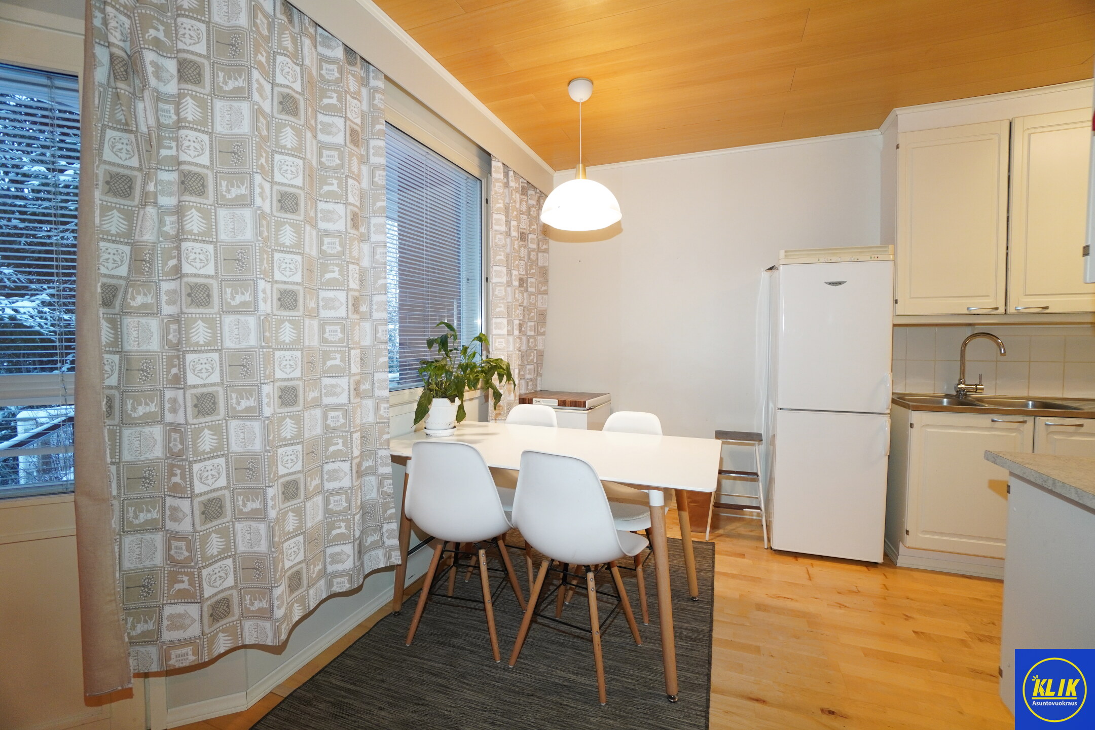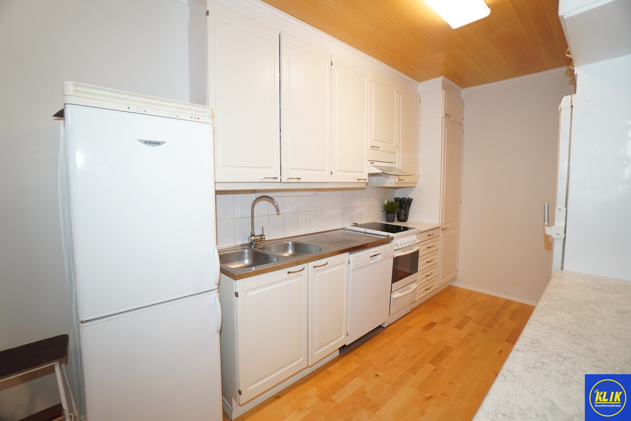 erillinen keittiöterästasot keittiössä; laminaattitasot keittiössä, sähköliesi; liesituuletin, astianpesukone (60cm), jääkaappi; pakastin, tilaa isolle ruokapöydälle; paljon kaappitilaa; paljon työskentelytilaa