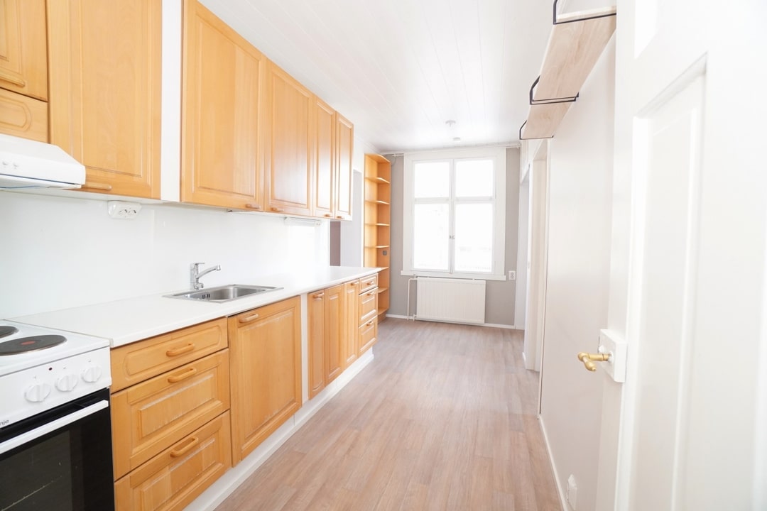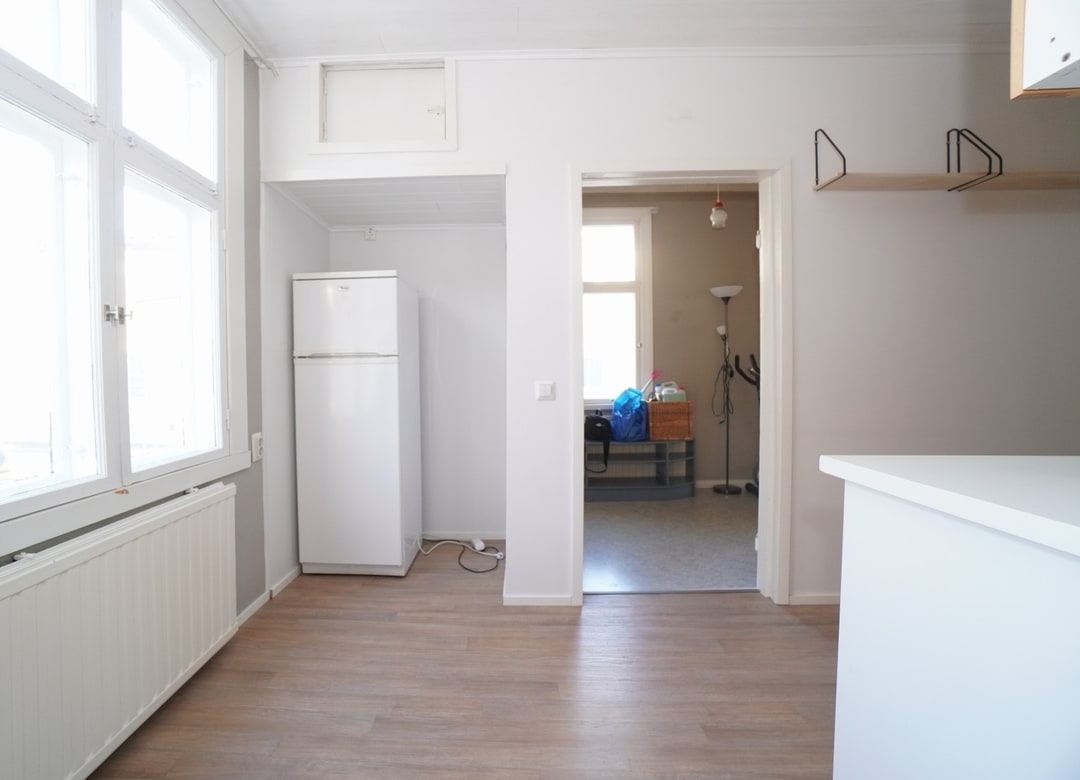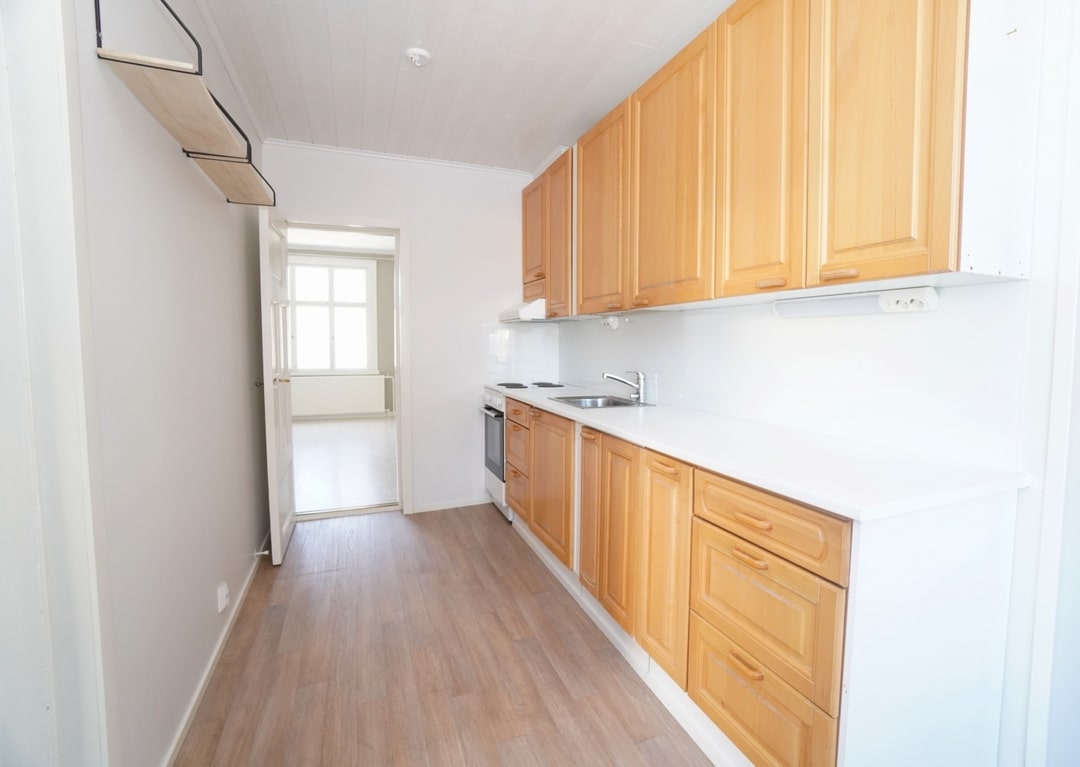 Asunnossa on siistit pinnat ja tilavat huoneet. Keittiössä on reilusti kaappitilaa ja sinne mahtuu myös ruokapöytä.