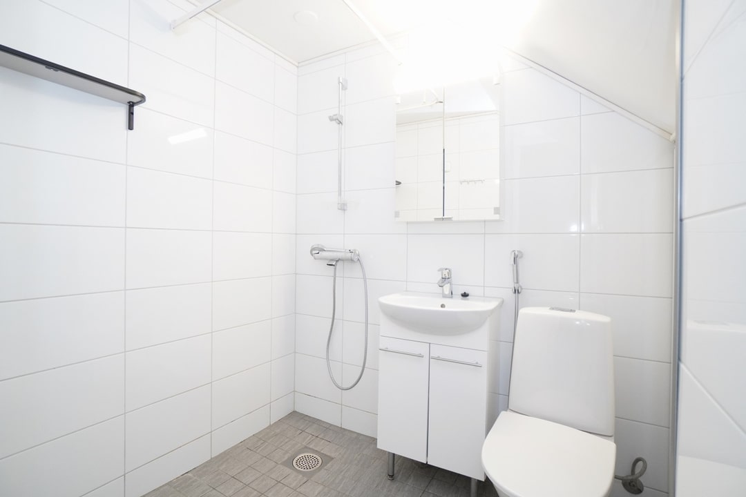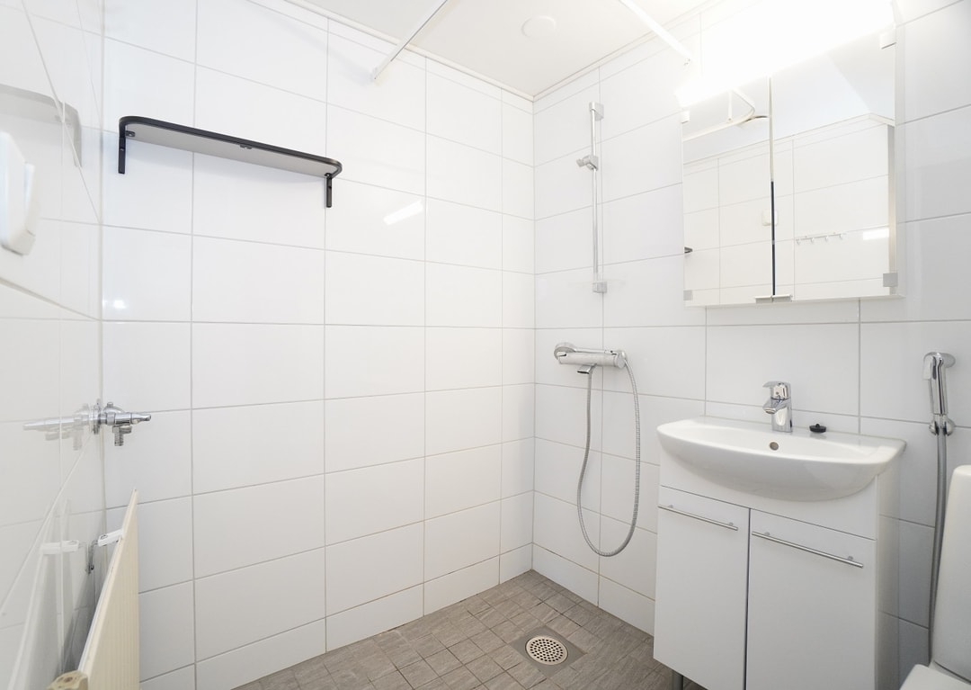 laattalattia; laattaseinä, allaskaappi; peilikaappi, suihku, pesukonevalmius, lattialämmitys