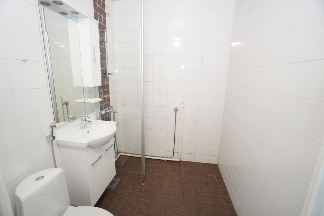 laattalattia; laattaseinä, allaskaappi; peilikaappi, suihku; suihkuseinä, pesukonevalmius