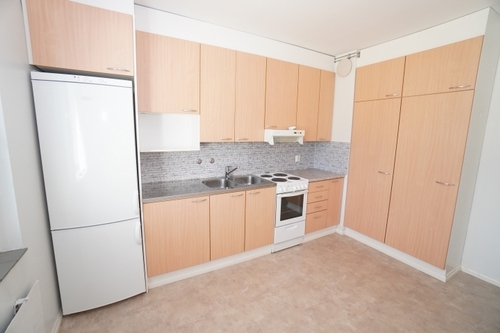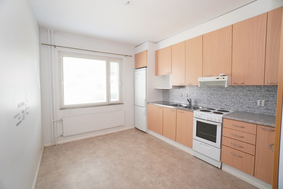 erillinen keittiö, terästasot keittiössä; laminaattitasot keittiössä, sähköliesi; liesituuletin, jääkaappipakastin, tilaa isolle ruokapöydälle; paljon kaappitilaa; paljon työskentelytilaa; mikrohylly