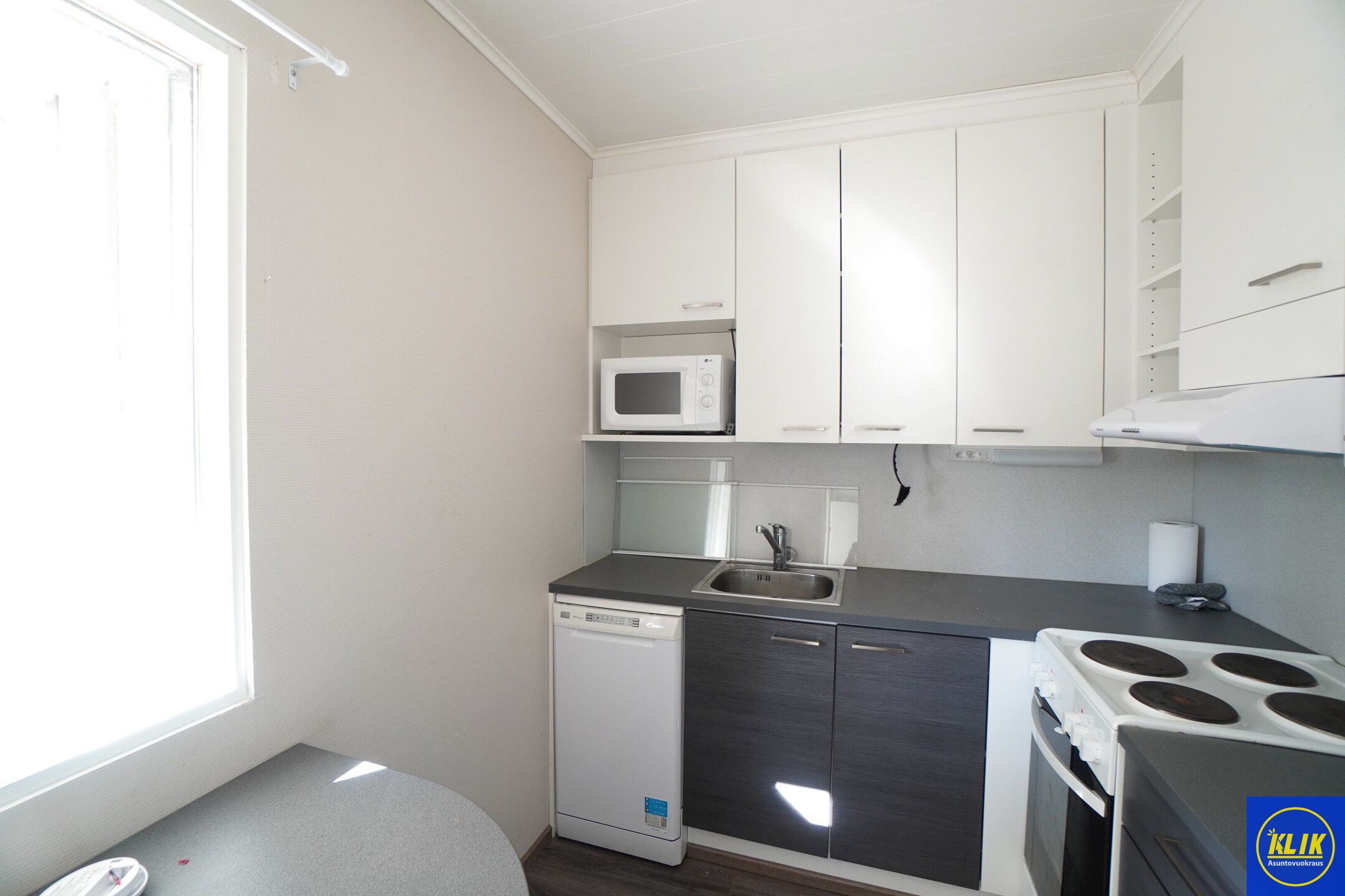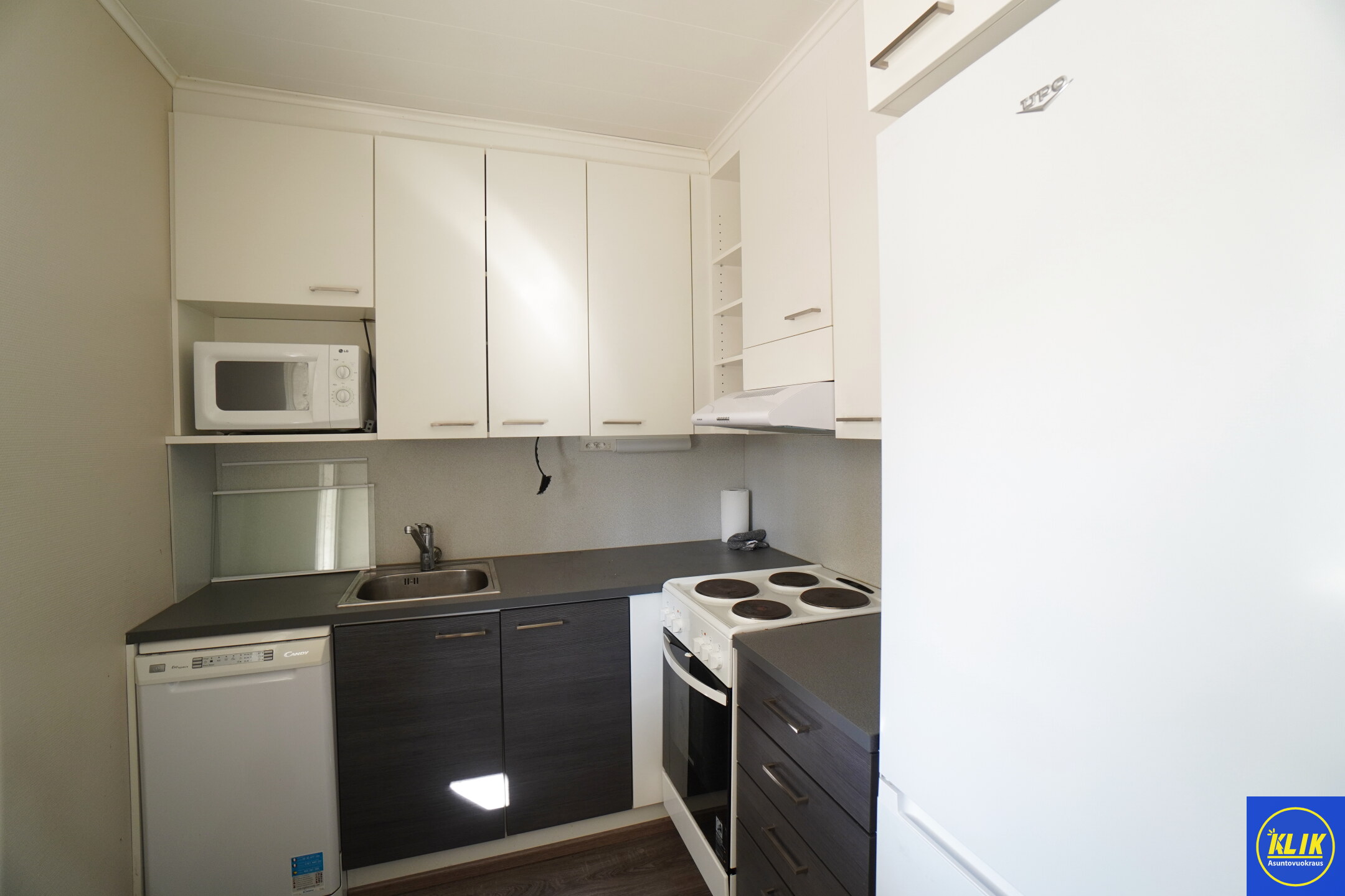 keittokomerolaminaattitasot keittiössä, sähköliesi; liesituuletin, astianpesukone (45cm), jääkaappipakastin, mikrohylly
