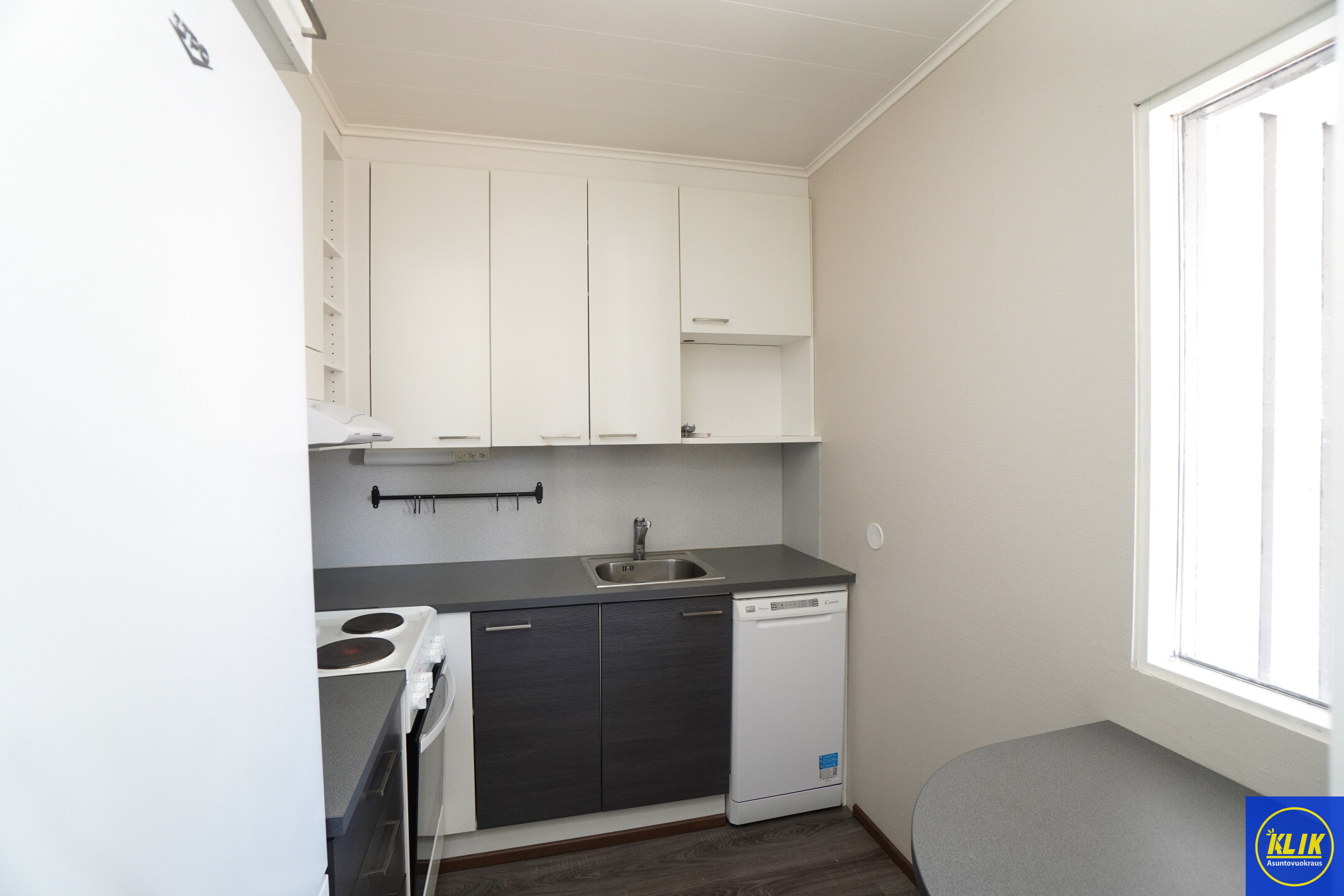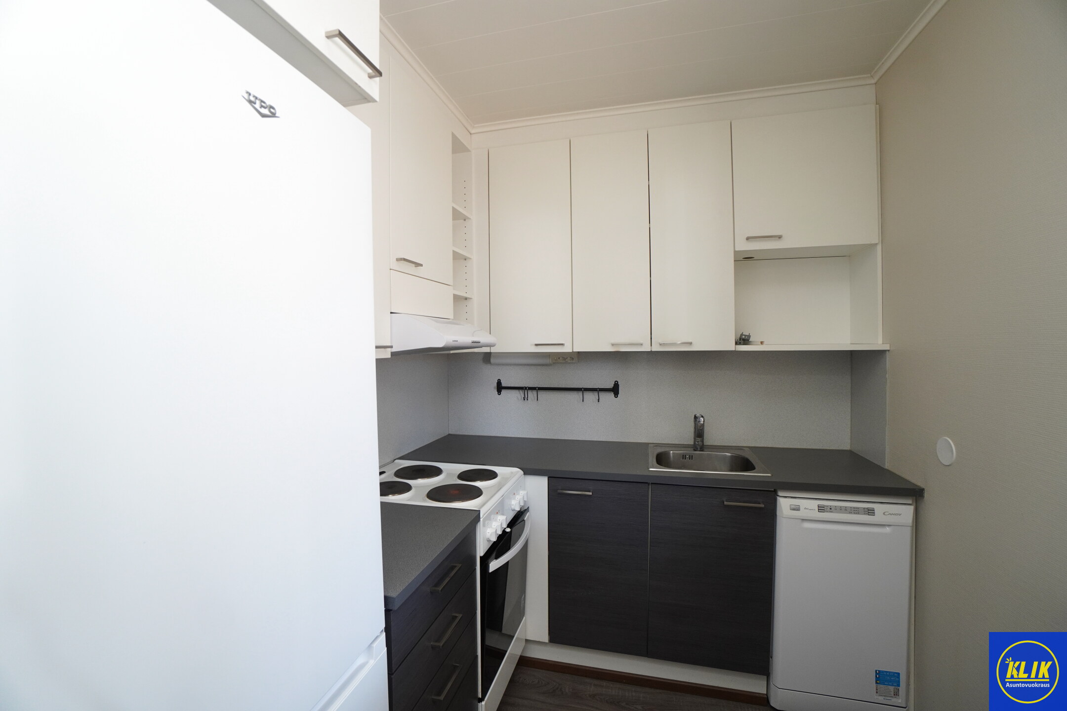 keittokomerolaminaattitasot keittiössä, sähköliesi; liesituuletin, astianpesukone (45cm), jääkaappipakastin, mikrohylly