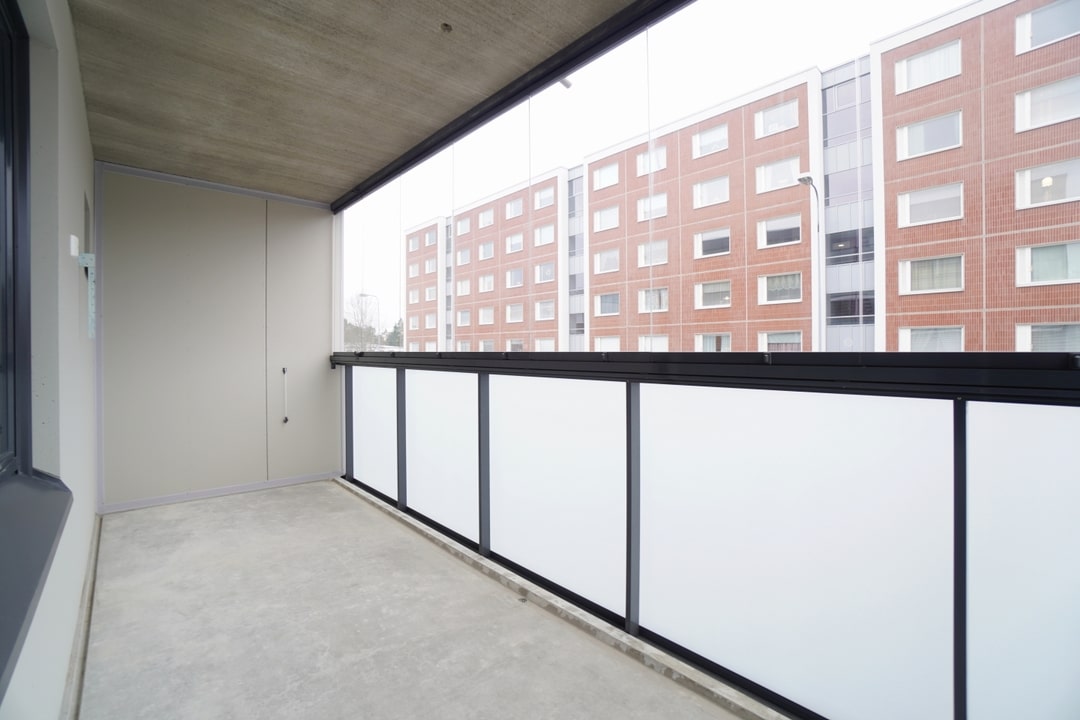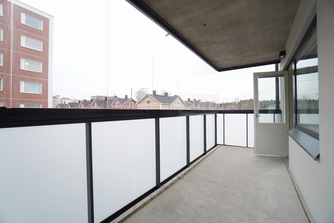 Asunnoissa on lasitetut parvekkeet, yksiöillä on käytössään yhteisparveke.