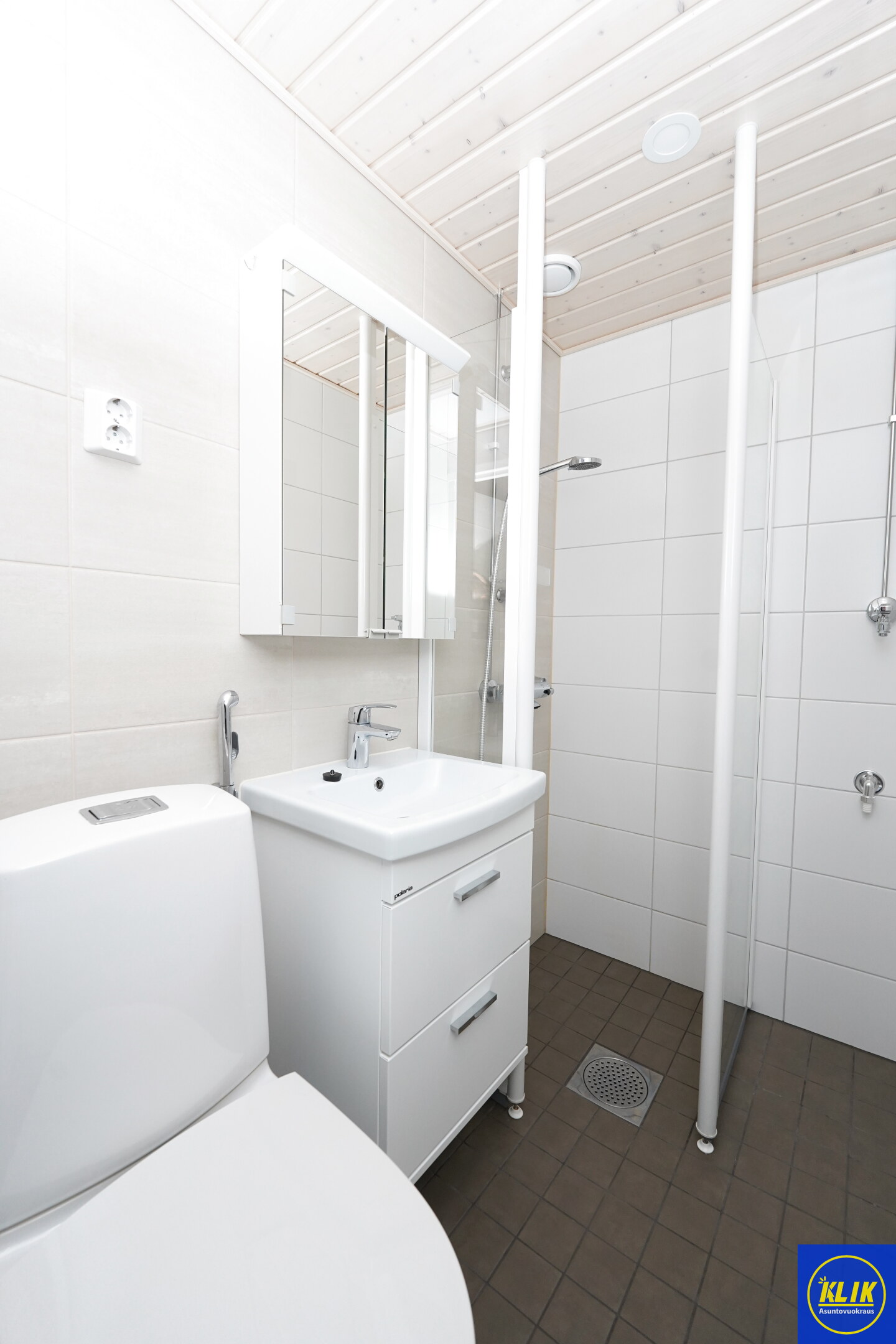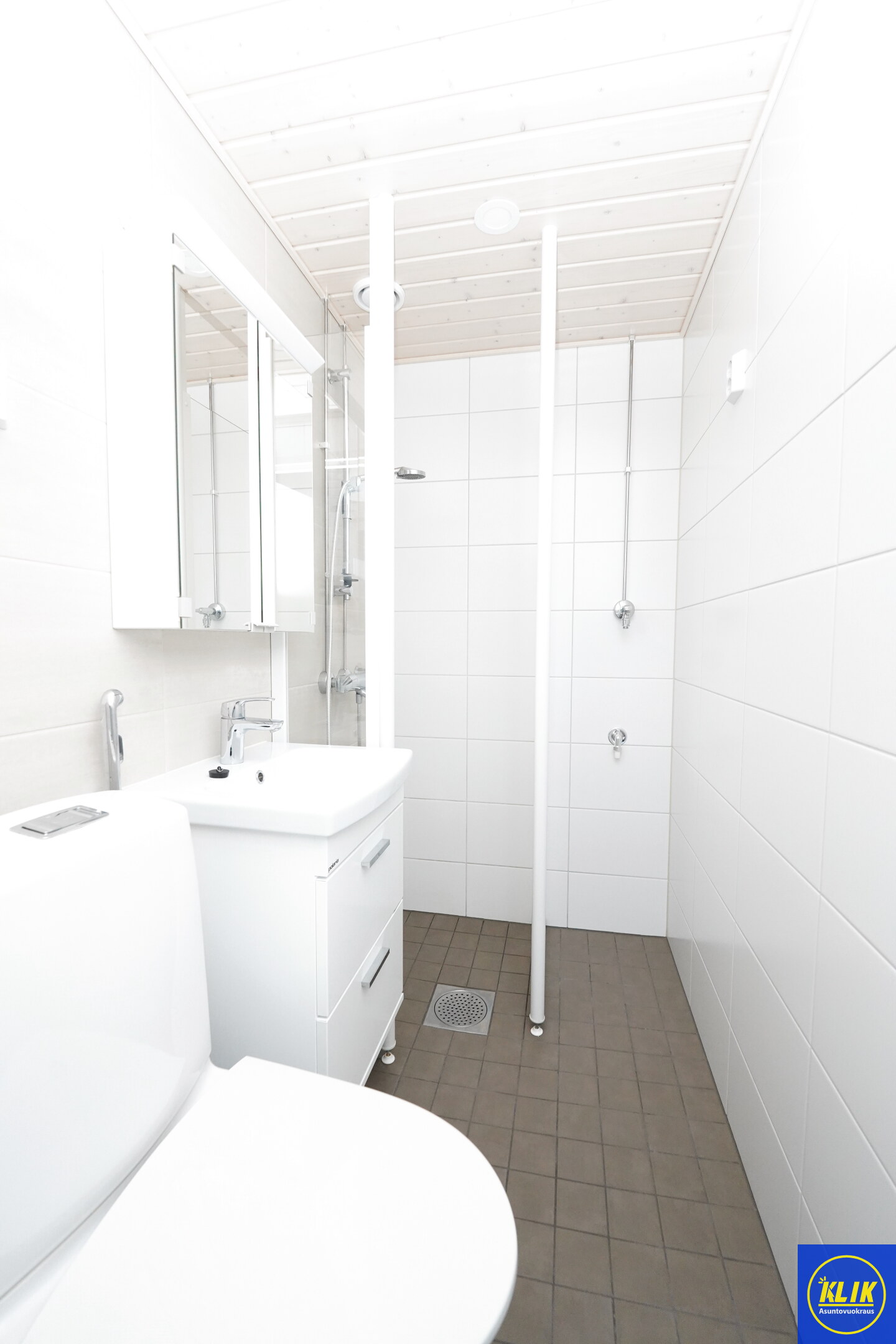 laattalattia; laattaseinä, , allaskaappi; peilikaappi, suihku; suihkuseinä, , pesukonevalmius; taloyhtiössä pesutupa; taloyhtiössä kuivaushuone, kylpyhuoneessa lattialämmitys; taloyhtiössä sauna