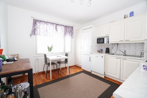 erillinen keittiö, laminaattitasot keittiössä, keraaminen- tai induktioliesi; liesituuletin, astianpesukone (60cm), jääkaappipakastin, tilaa isolle ruokapöydälle; paljon kaappitilaa; paljon työskentelytilaa; mikrohylly