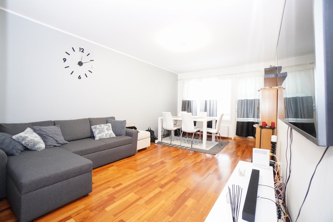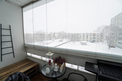 Olohuoneen yhteydessä on lasitettu parveke, jonne mahtuvat kesäkalusteet ja jossa saa nauttia ilta-auringosta. Koko asunnossa on kaunis parketti ja seinäpinnat ovat siistit. Makuuhuoneessa on kivasti säilytystilaa ja lisää tuovat eteisen peililiukuovikaapistot.
