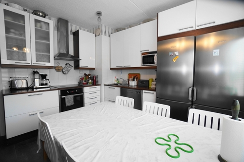 Keittiö on uudenveroisessa kunnossa ja kaikki kodinkoneet ovat siistit. Valkoiset siistit kaapistot joihin mahtuu kaikki tarpeellinen. Kaksi jääkaappipakastinta helpottavat ison perheen arkea. Tiskikone löytyy myös tästä keittiöstä.