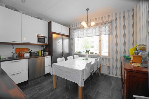 erillinen keittiö, laminaattitasot keittiössä, keraaminen- tai induktioliesi; liesi ja uuni erikseen; liesituuletin, astianpesukone (60cm), jääkaappipakastin, tilaa isolle ruokapöydälle; paljon kaappitilaa; mikrohylly