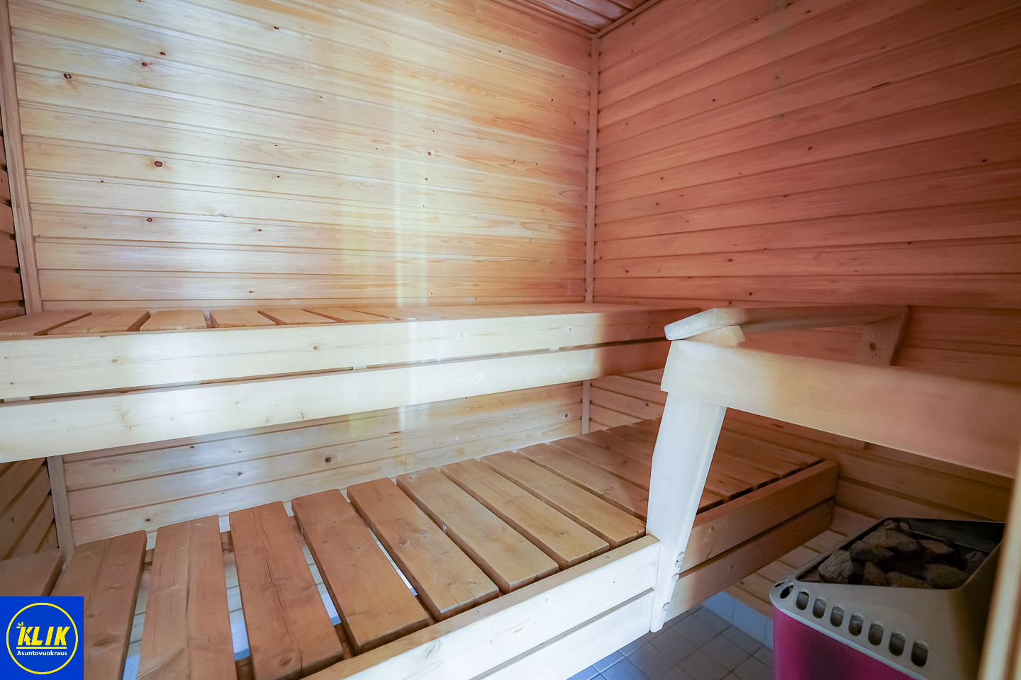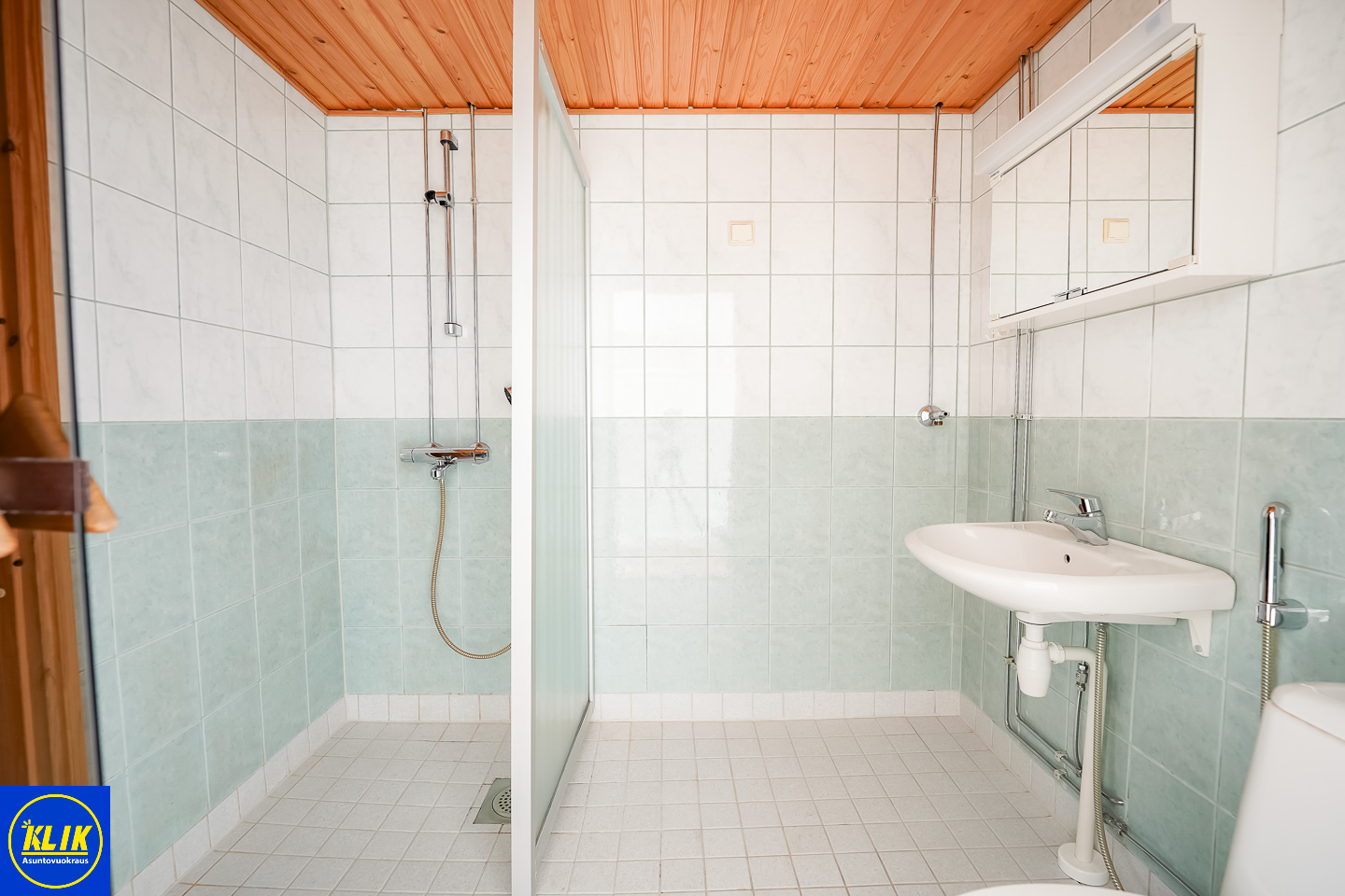 laattalattia; laattaseinä, asunnossa kaksi WC:tä, peilikaappi, suihku; suihkuseinä, , pesukonevalmius; taloyhtiössä pesutupa, kylpyhuoneessa lattialämmitys; oma sauna
