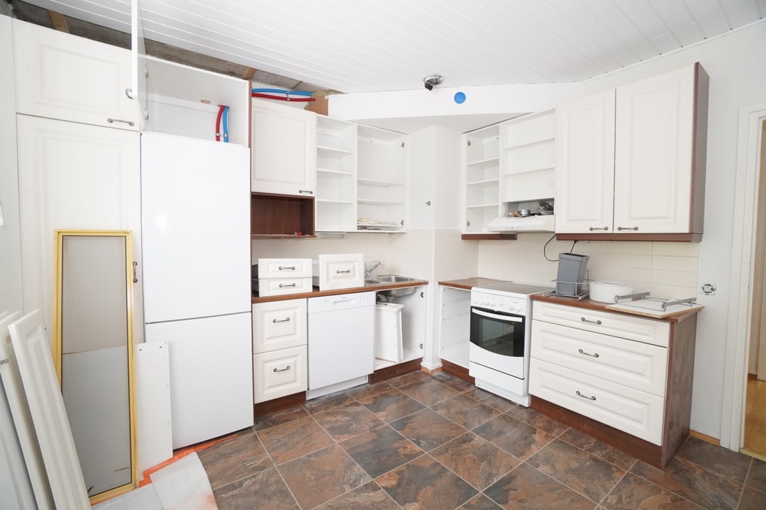 Tässä kodissa on neliöitä isommallekin perheelle ja lattiassa on kaunis ja kestävä parketti. Keittiötä remontoidaan parhaillaan, ja sinne on tulossa vaaleat kaapistot. Kodinkoneet on myös uusittu ja asennettu astianpesukone. Tilaa on hyvin ison perheen ruokapöydälle.