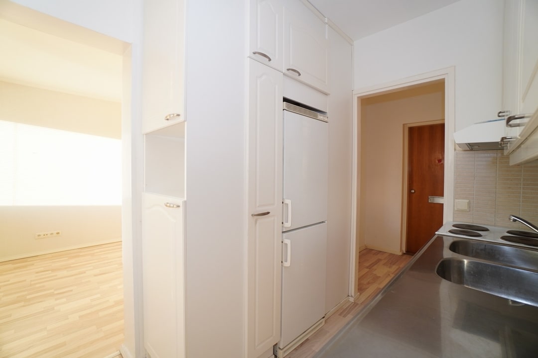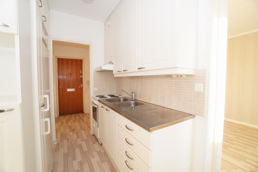 Siistikuntoinen kaksio talon 4. kerroksesta heti vapaana. Asunnossa on tilava olohuone parvekkeella, erillinen makuuhuone, remontoitu kylpyhuone sekä reilun kokoinen vaatehuone. Kaikki pinnat ovat siistissä kunnossa, lattiassa on vaalea laminaatti ja seinät on maalattu.