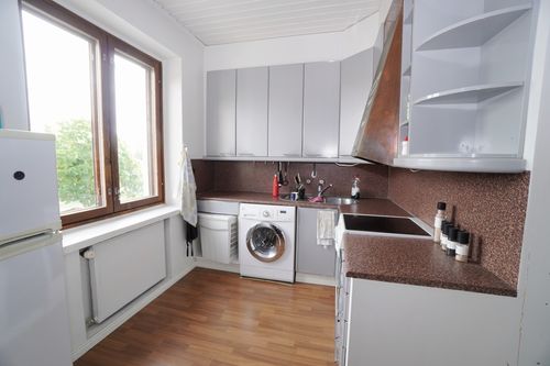 Keittiökin on reilun kokoinen. Keittiössä on mm. hyvin kaappitilaa, pyykinpesukone valmiina vuokralaisen käytettäväksi sekä hyvä paikka ruokailuryhmälle.
