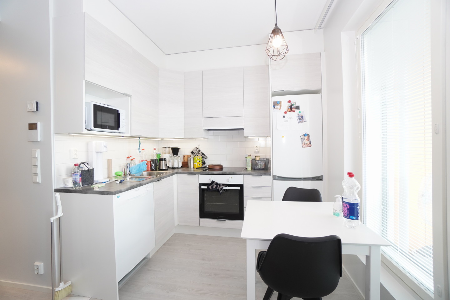 avokeittiölaminaattitasot keittiössä, keraaminen- tai induktioliesi; liesi ja uuni erikseen; liesituuletin, astianpesukone (60cm), jääkaappipakastin, mikrohylly , , , , , ,
