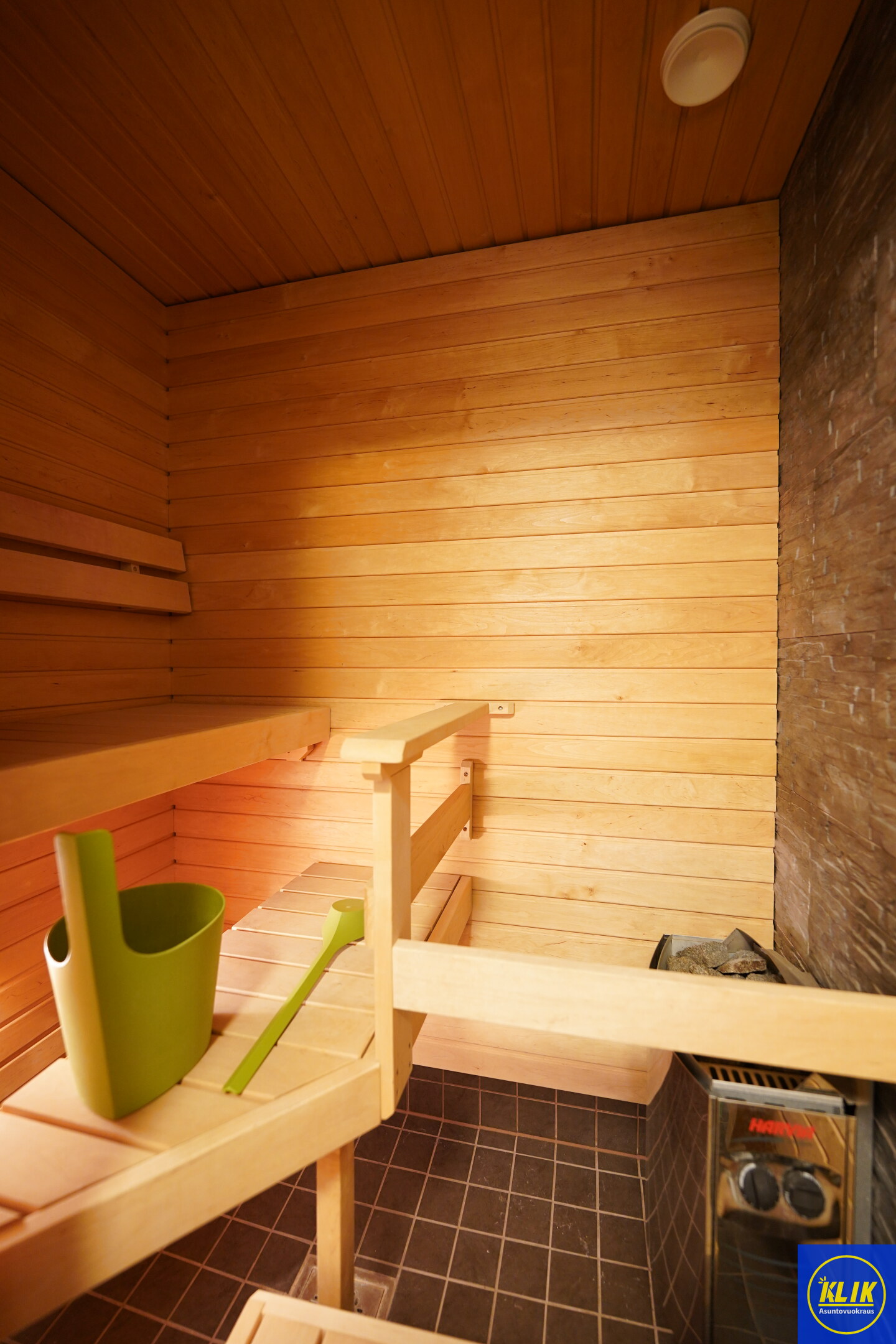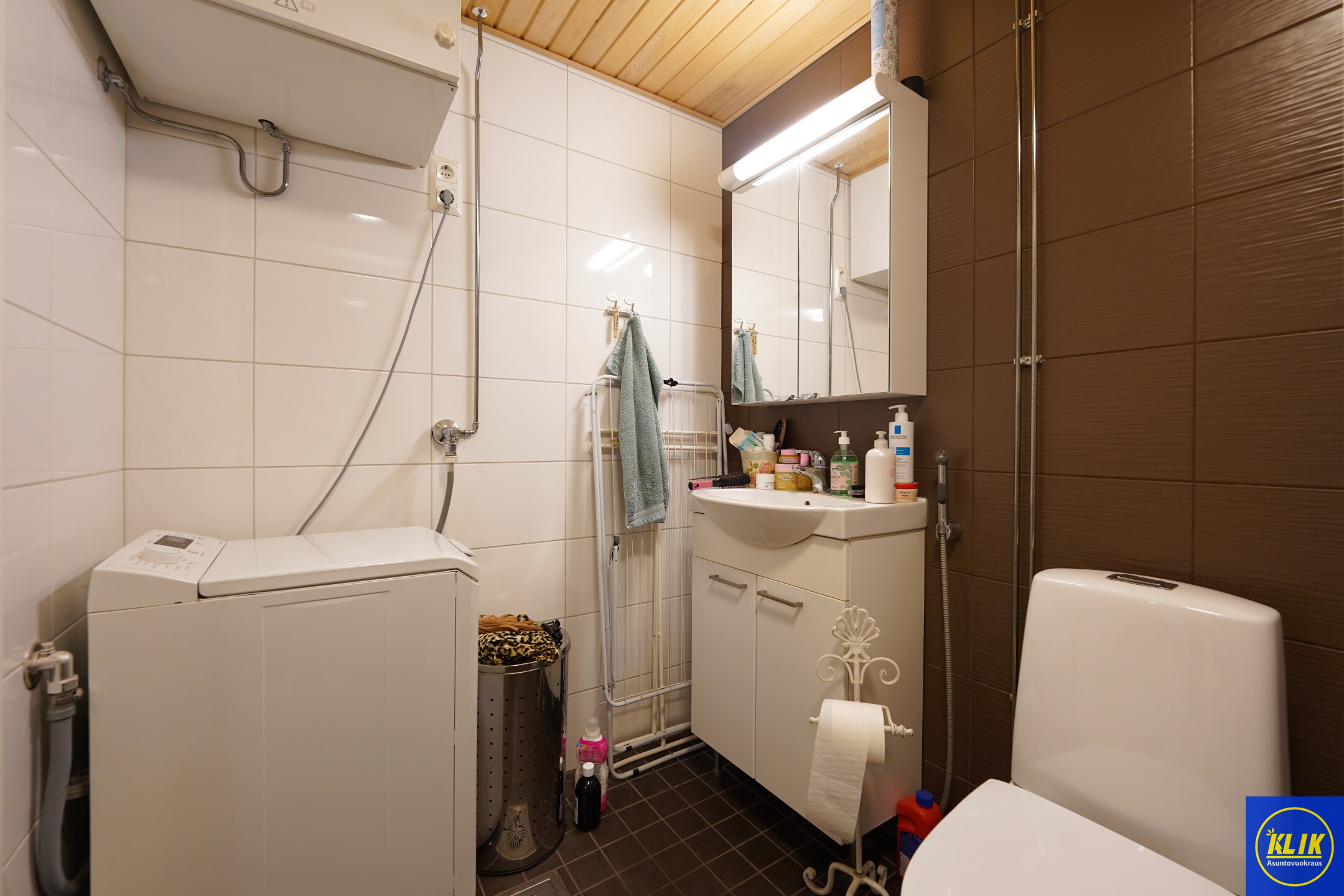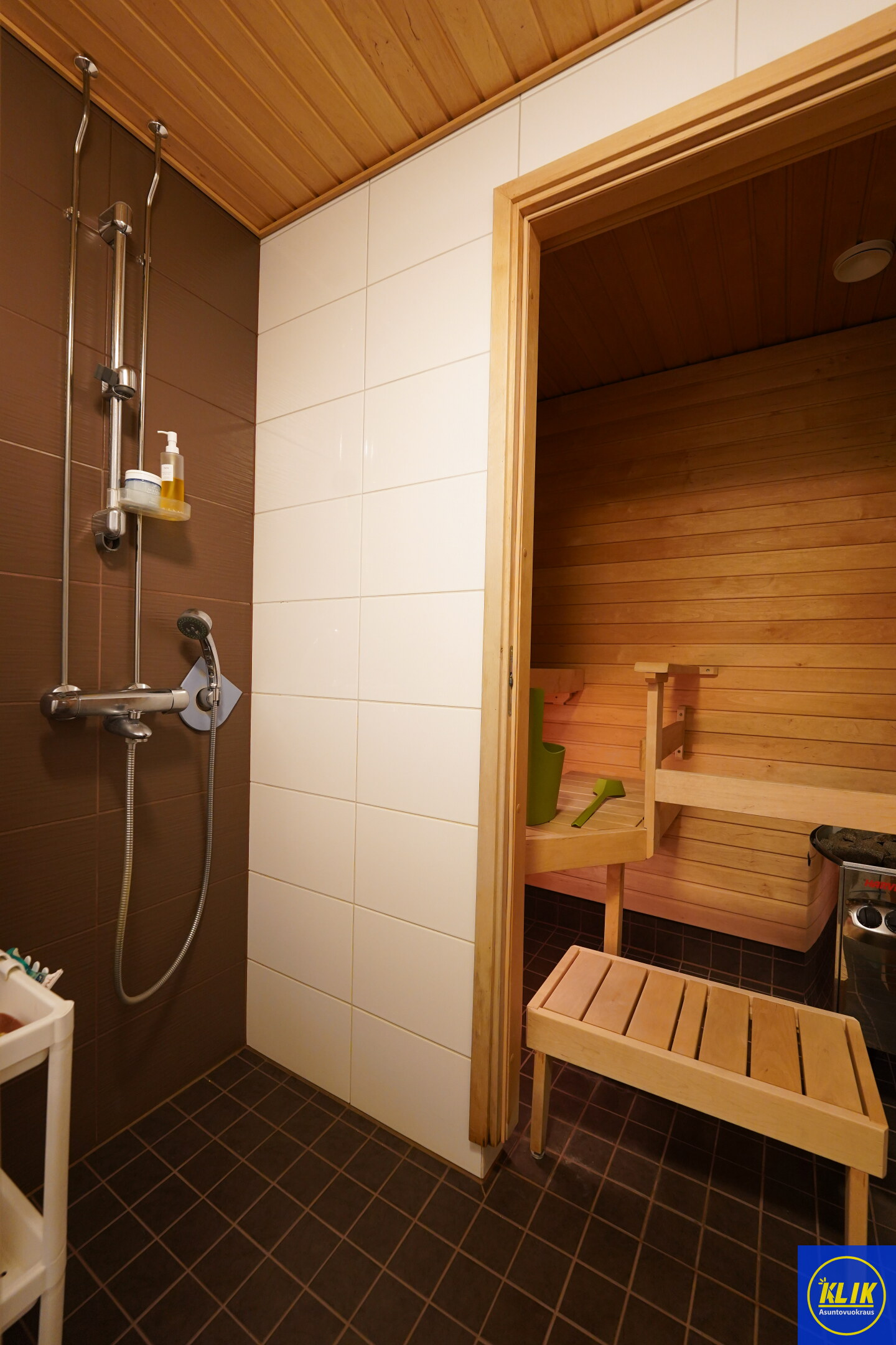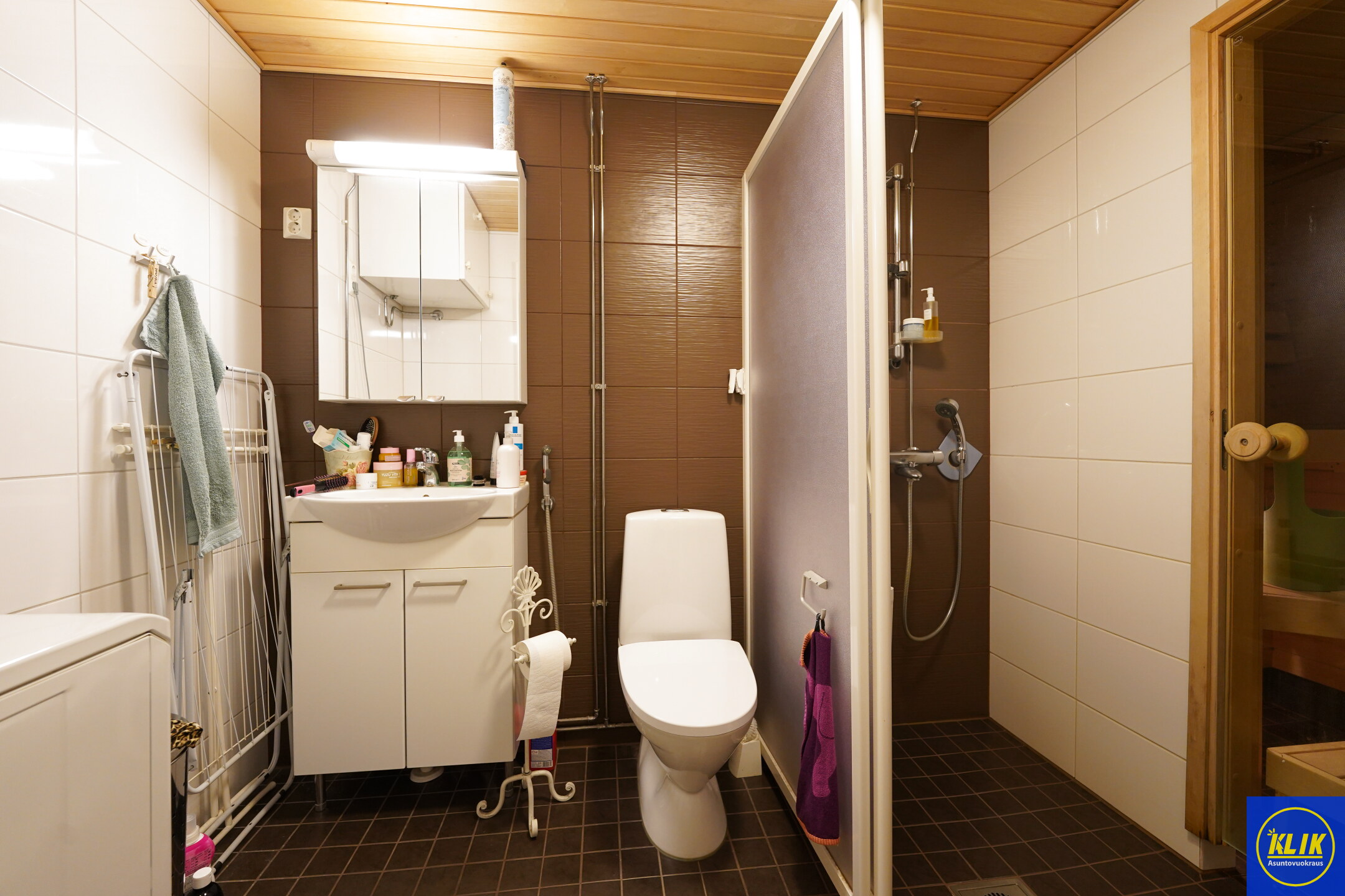 laattalattia; laattaseinä, allaskaappi; peilikaappi, suihku; suihkuseinä, pesukonevalmius, kylpyhuoneessa lattialämmitys; oma sauna