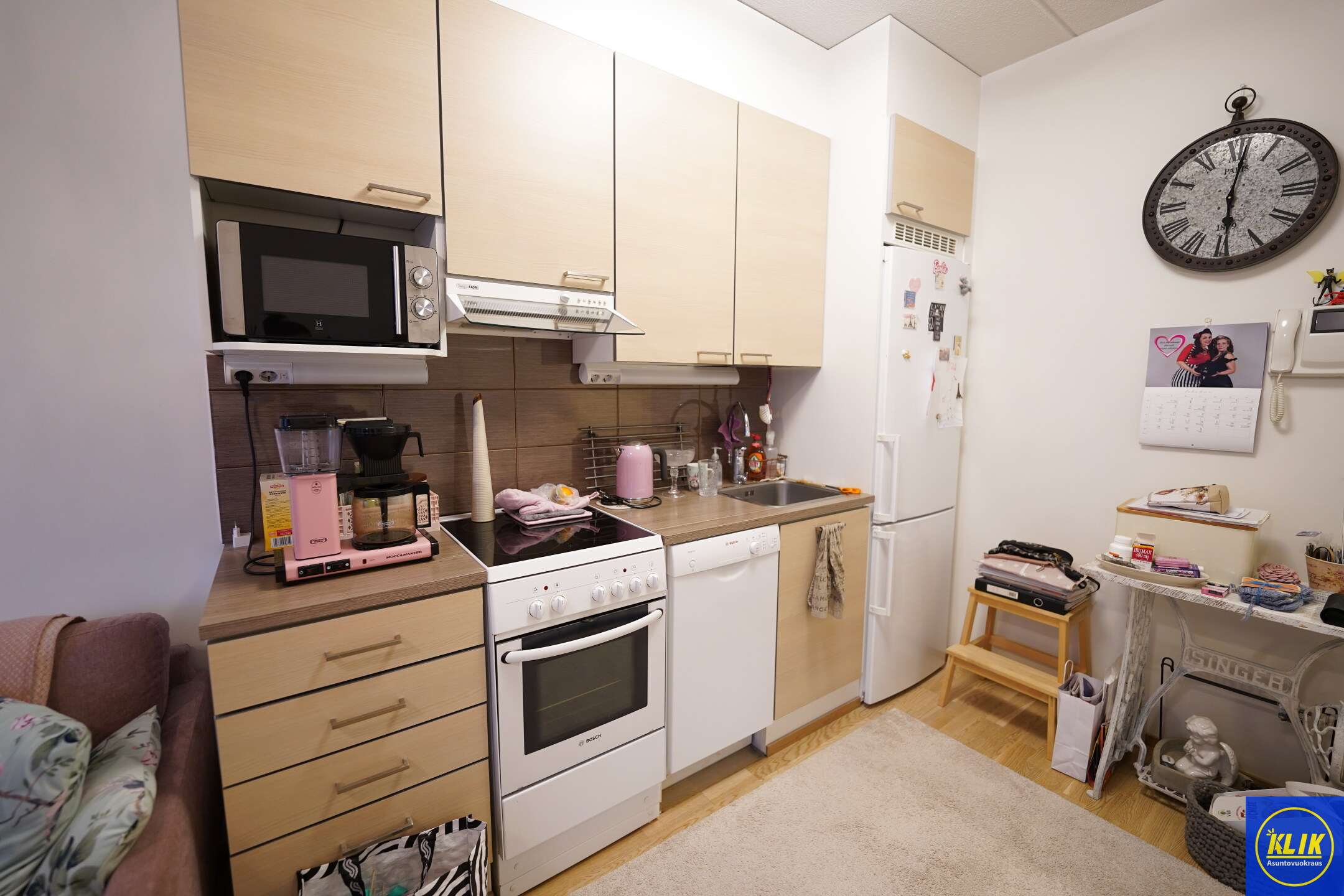 avokeittiölaminaattitasot keittiössä, keraaminen- tai induktioliesi; liesituuletin, astianpesukone (45cm), jääkaappipakastin, mikrohylly