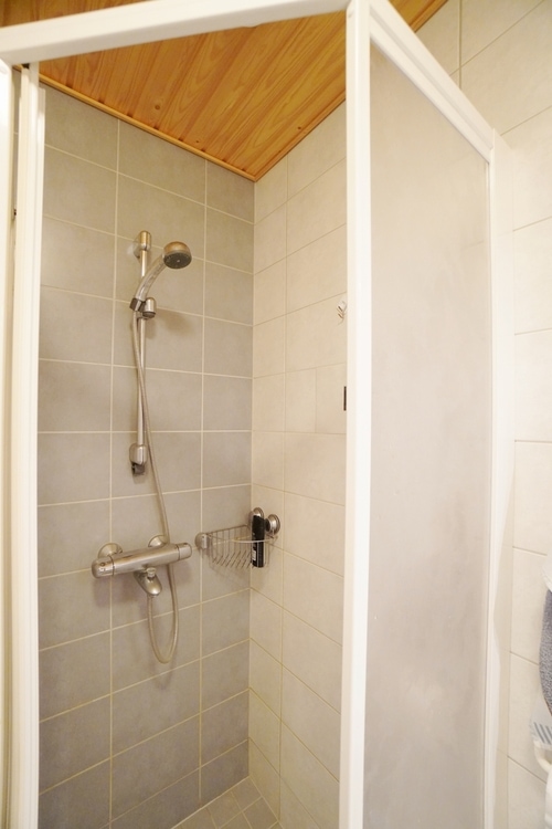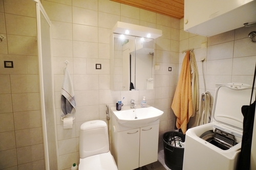 Kylpyhuone on tilava ja siellä on liitännät pesukoneelle, sekä hyvin säilytystilaa. Oma sauna on iso plussa kompaktin kokoisessa asunnossa. Säilytystilaa asunnosta löytyy hyvin vaatehuoneen ansiosta!